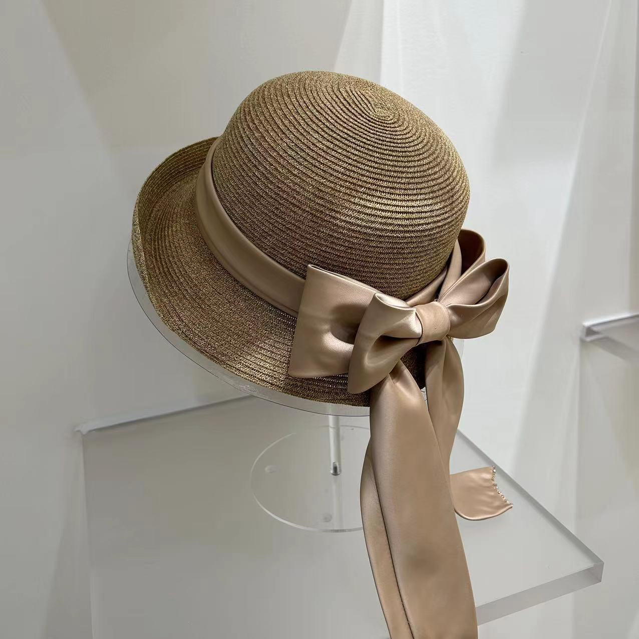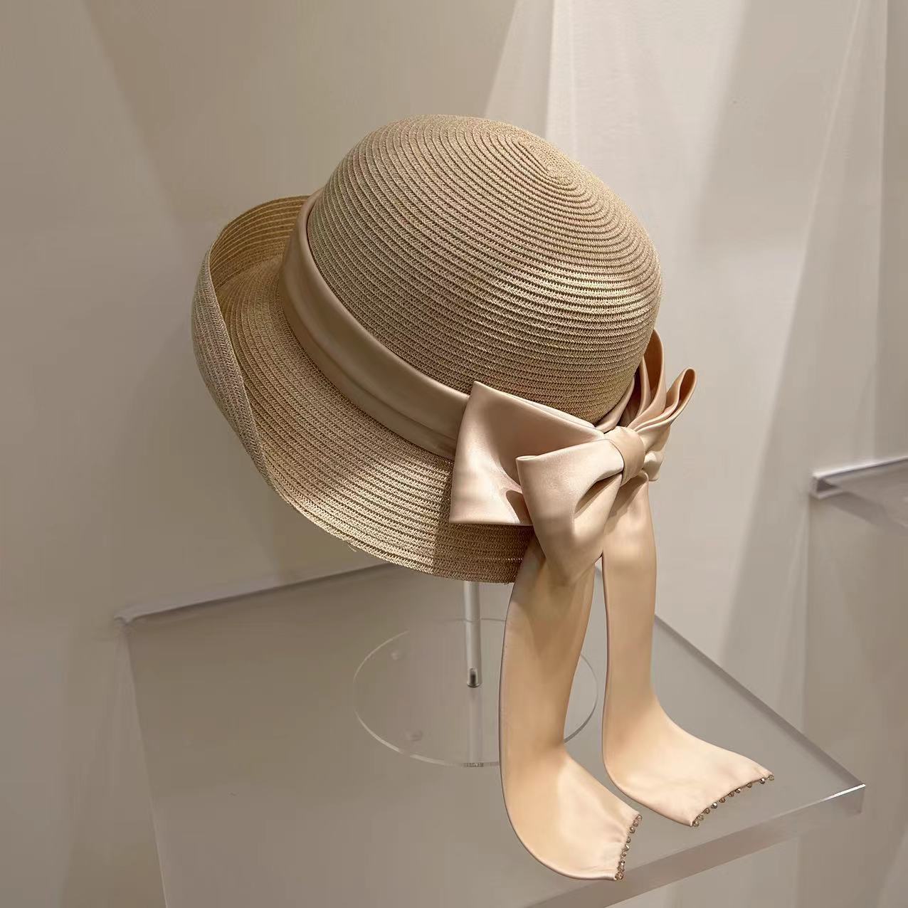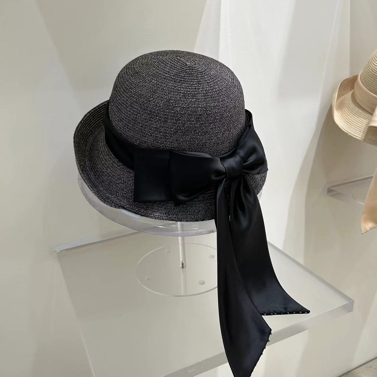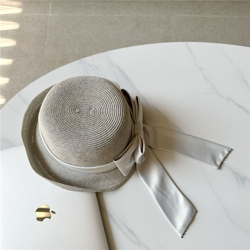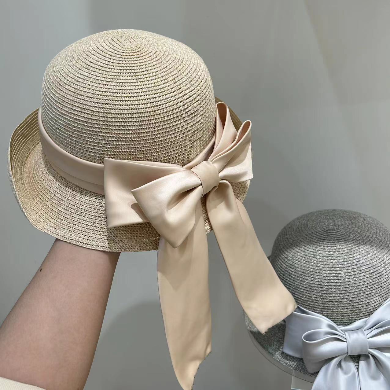 Women's Fashion Simple Large Ribbon Bow Straw Bucket Hat