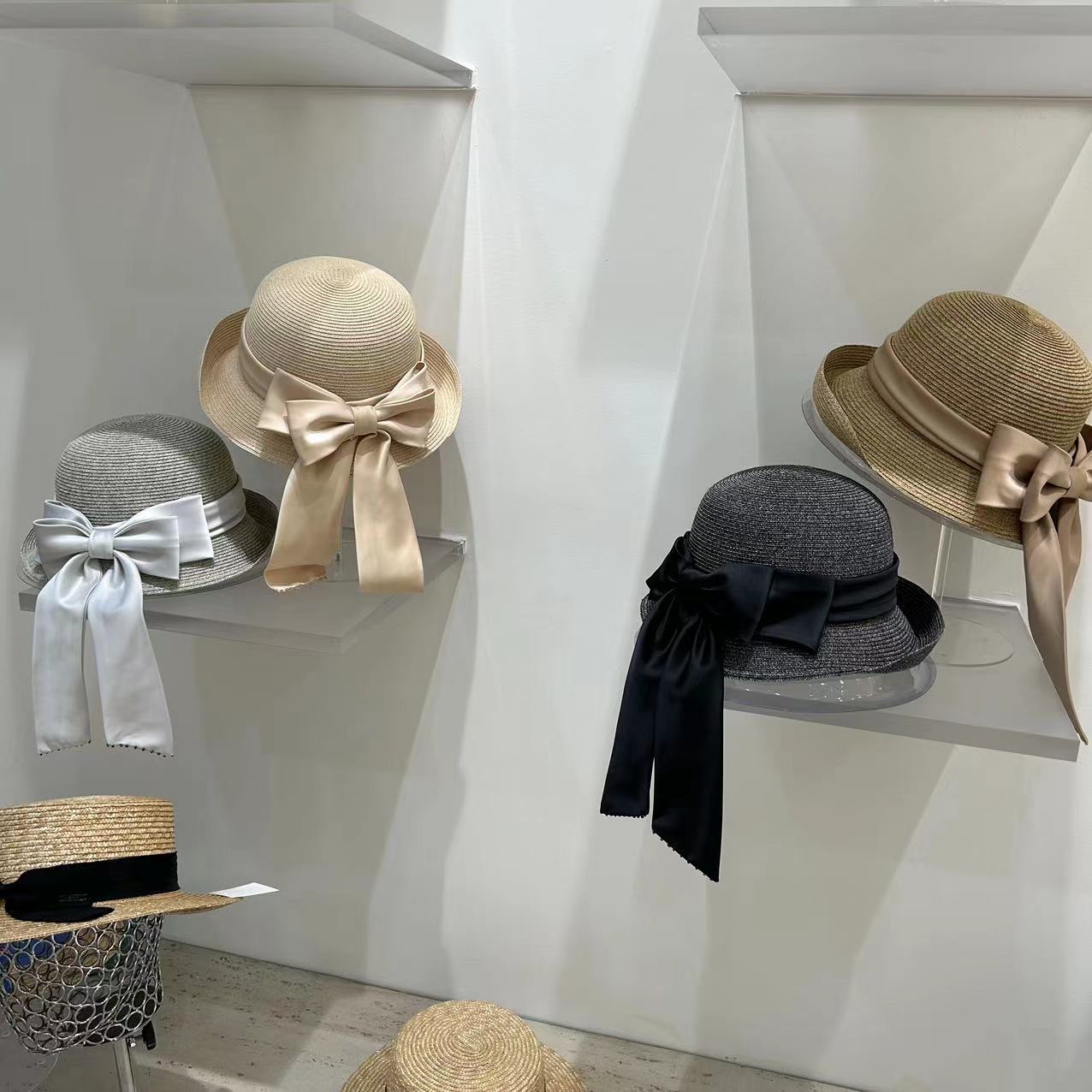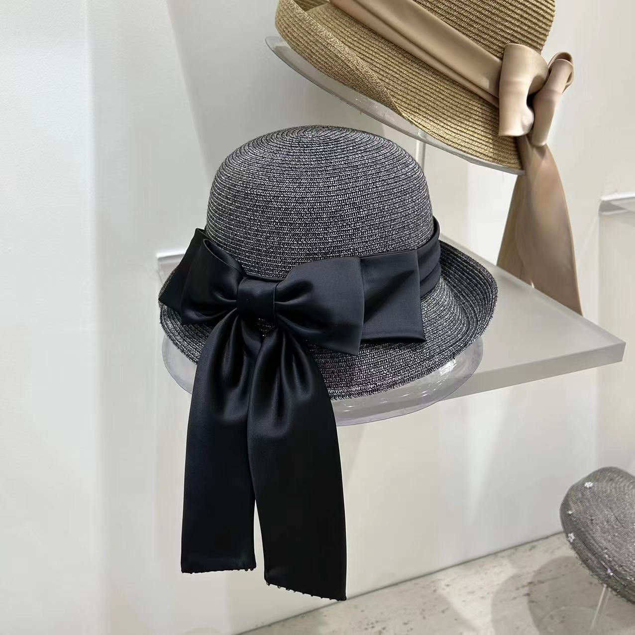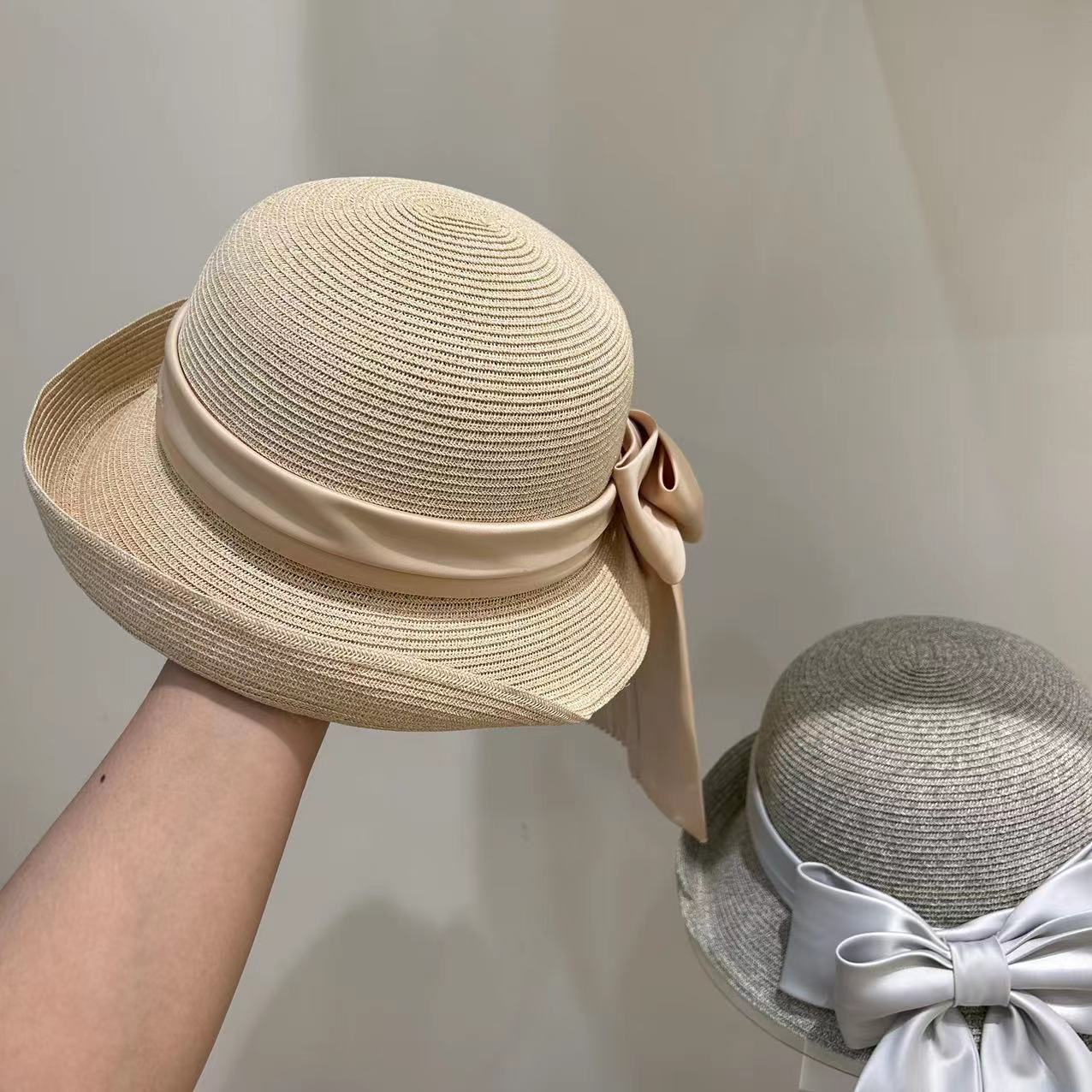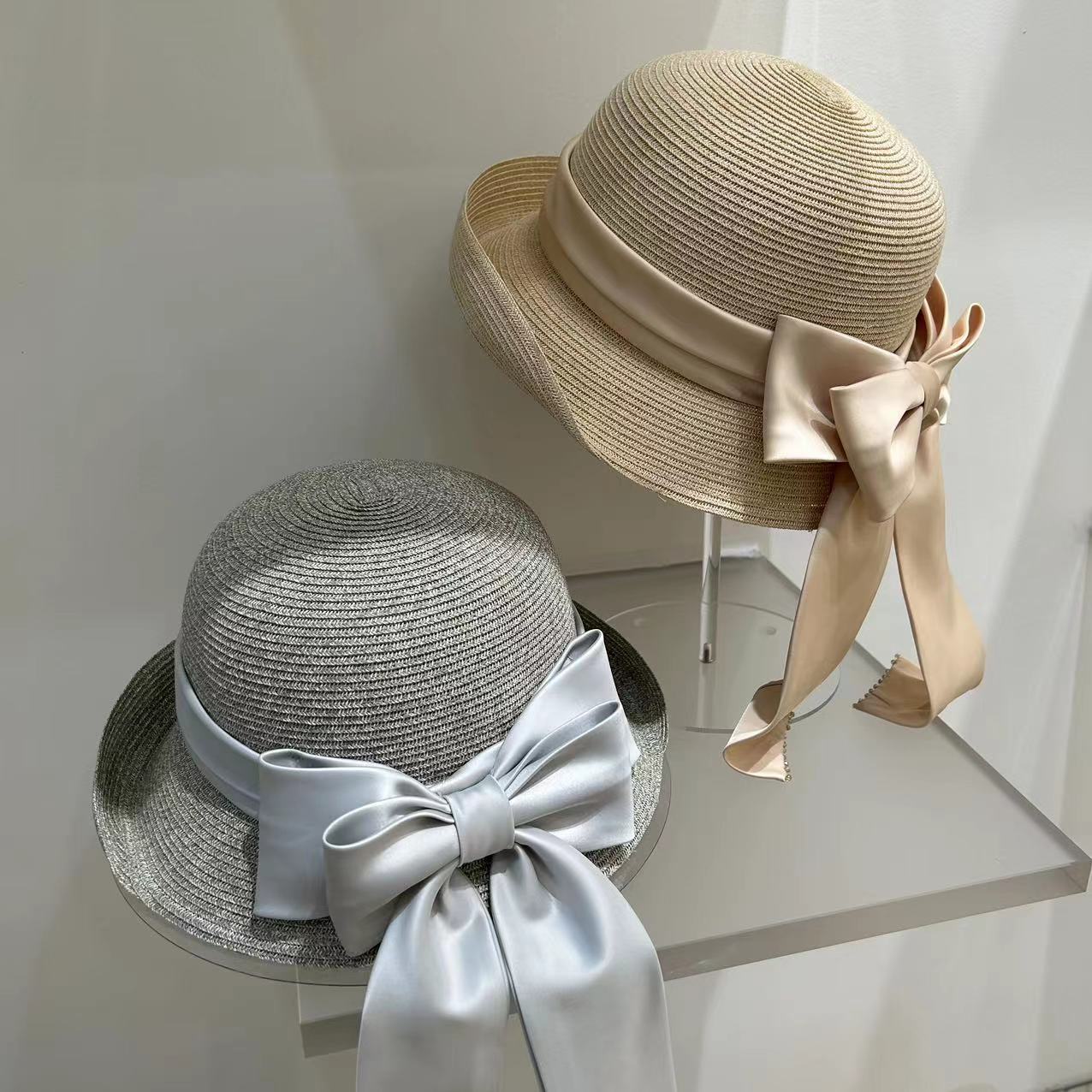 Women's Fashion Simple Large Ribbon Bow Straw Bucket Hat