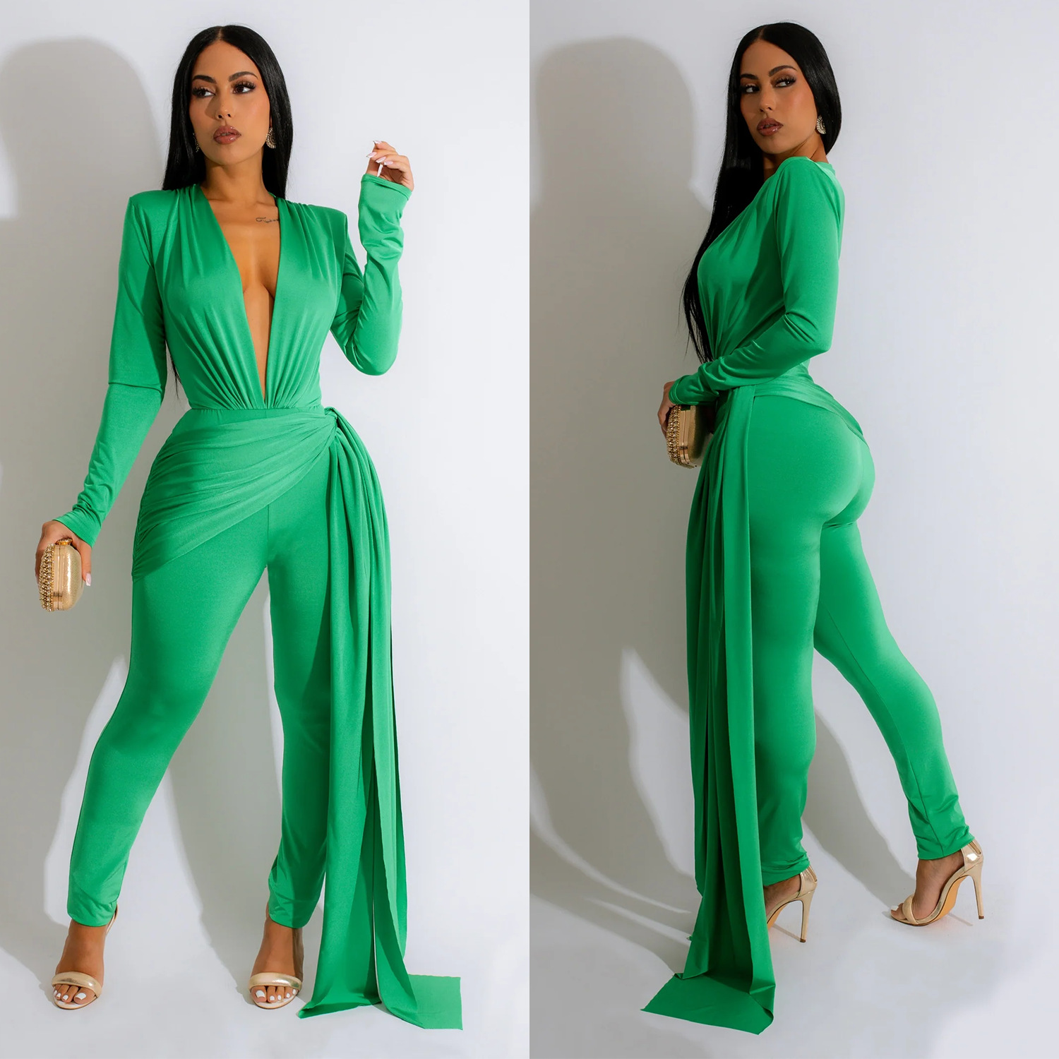 Women's Fashion Skinny V-neck Long Sleeve Jumpsuit