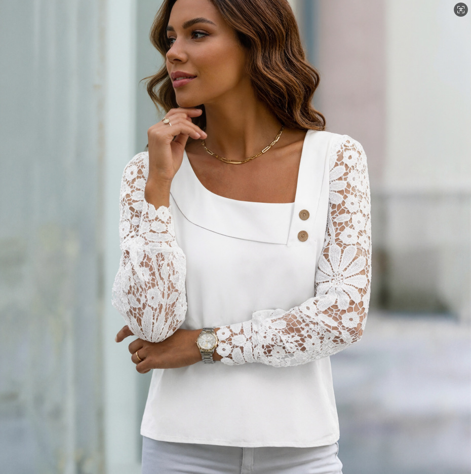 Womens Fashion Solid-Color Long-Sleeve Lace-Patchwork Shirt