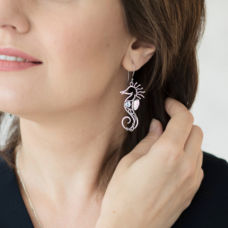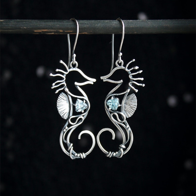 Women's Fashion Vintage Ocean Blue Gemstone Hollow Seahorse Earrings