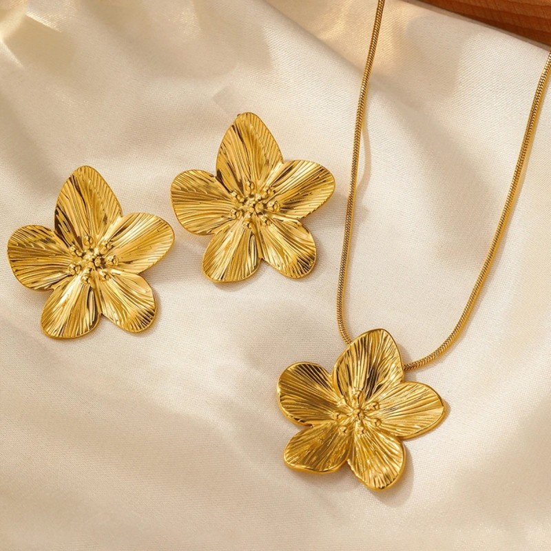 Womens Fashionable 3D Exaggerated Five-Petal Flower Necklace And Earrings