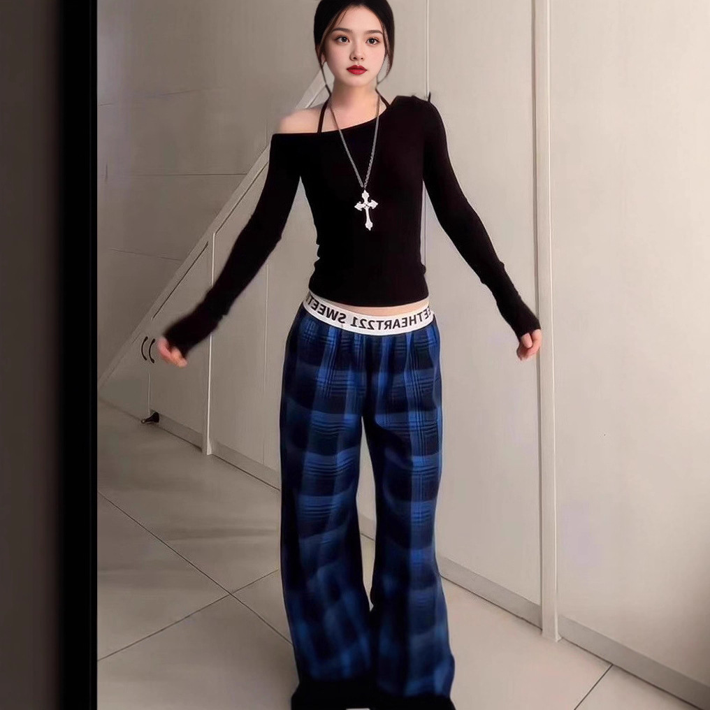 Womens Fashionable Retro Plaid Wide-Leg Pants