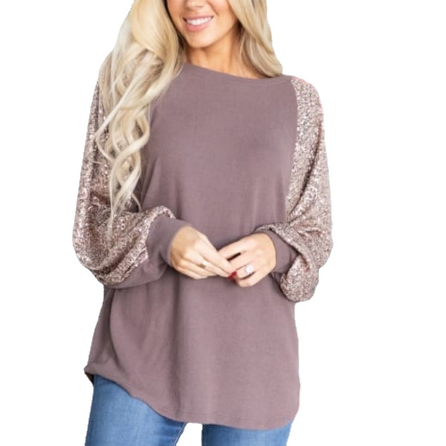 Women's Fashionable Sequins Stitching Round Neck Loose Top