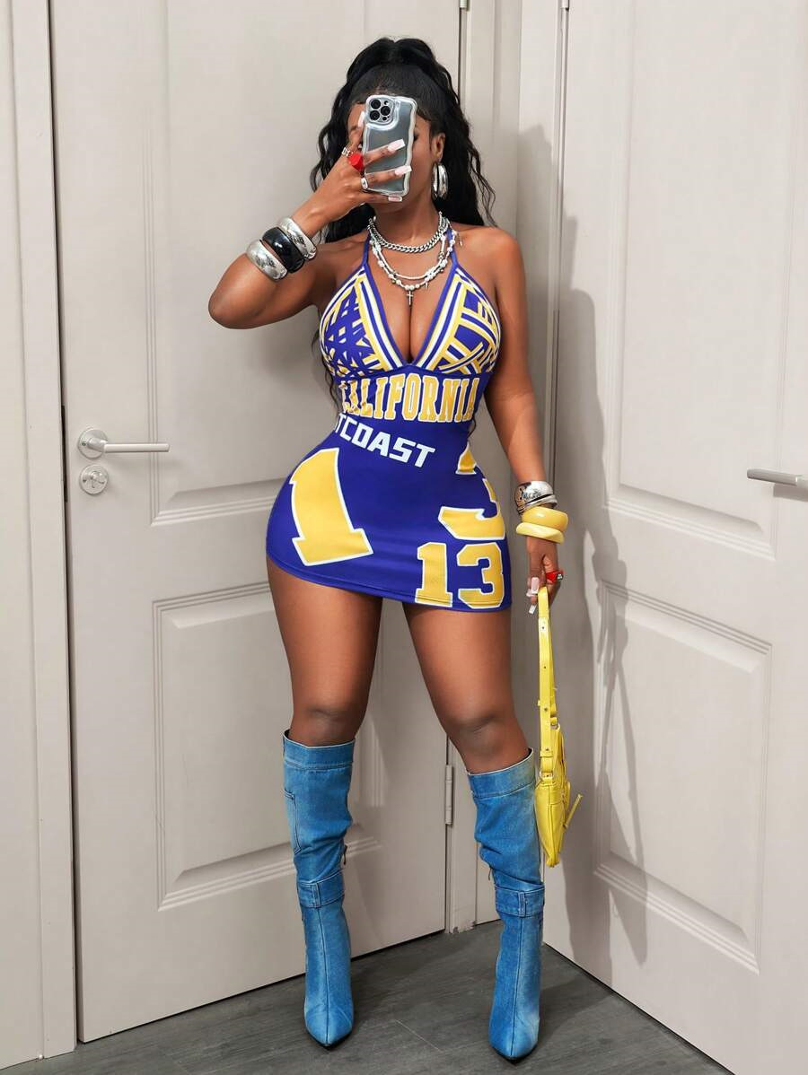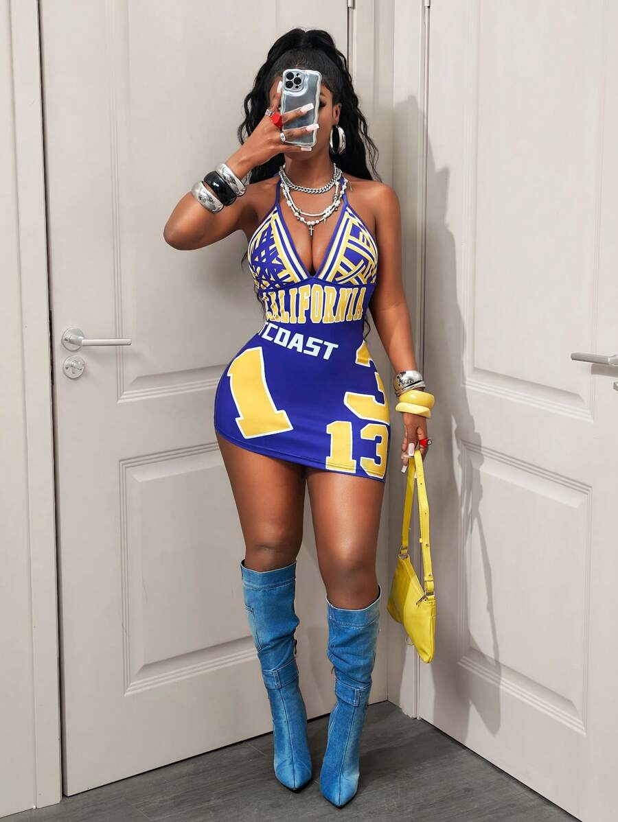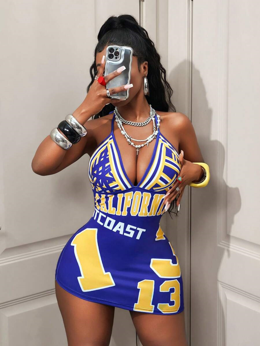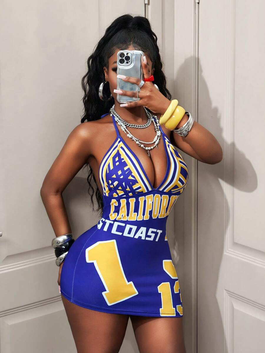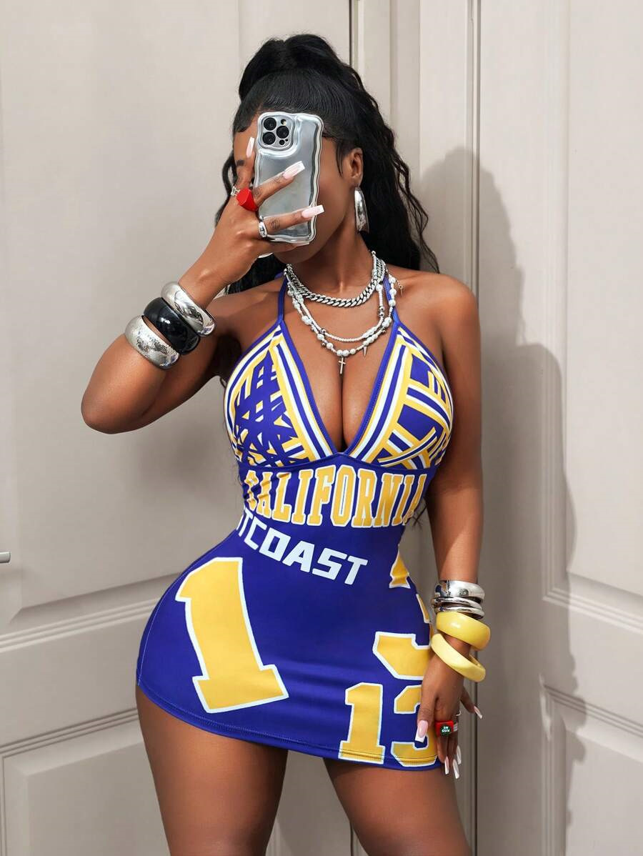 Womens Fashionable Sexy Printed Halterneck Deep-V Backless Dress