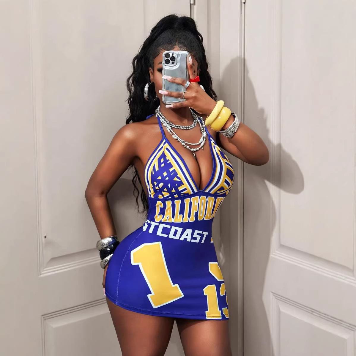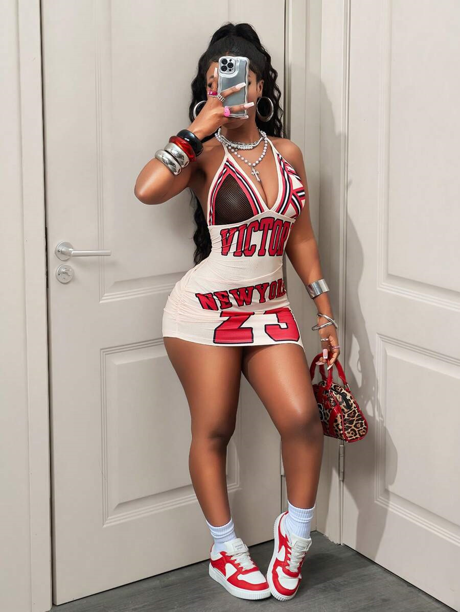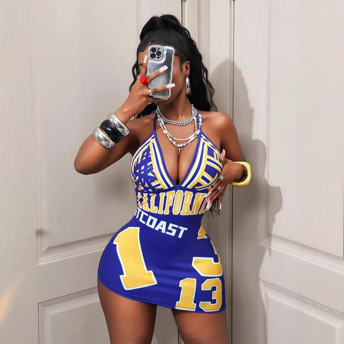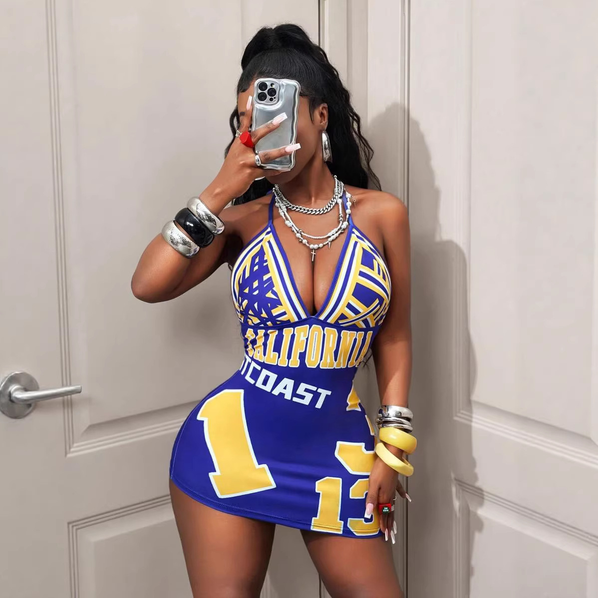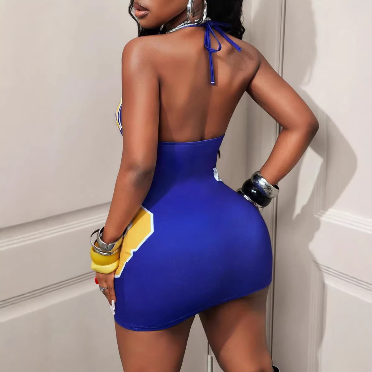 Womens Fashionable Sexy Printed Halterneck Deep-V Backless Dress
