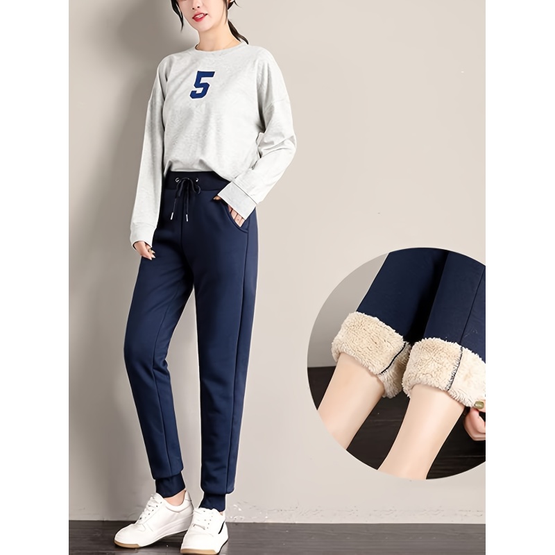 Women's Fleece Sweatpants Jogger Fleece Pants With Drawstring Waist, Boyfriend Style, Long, Solid Color, Slightly Stretchy Fabric