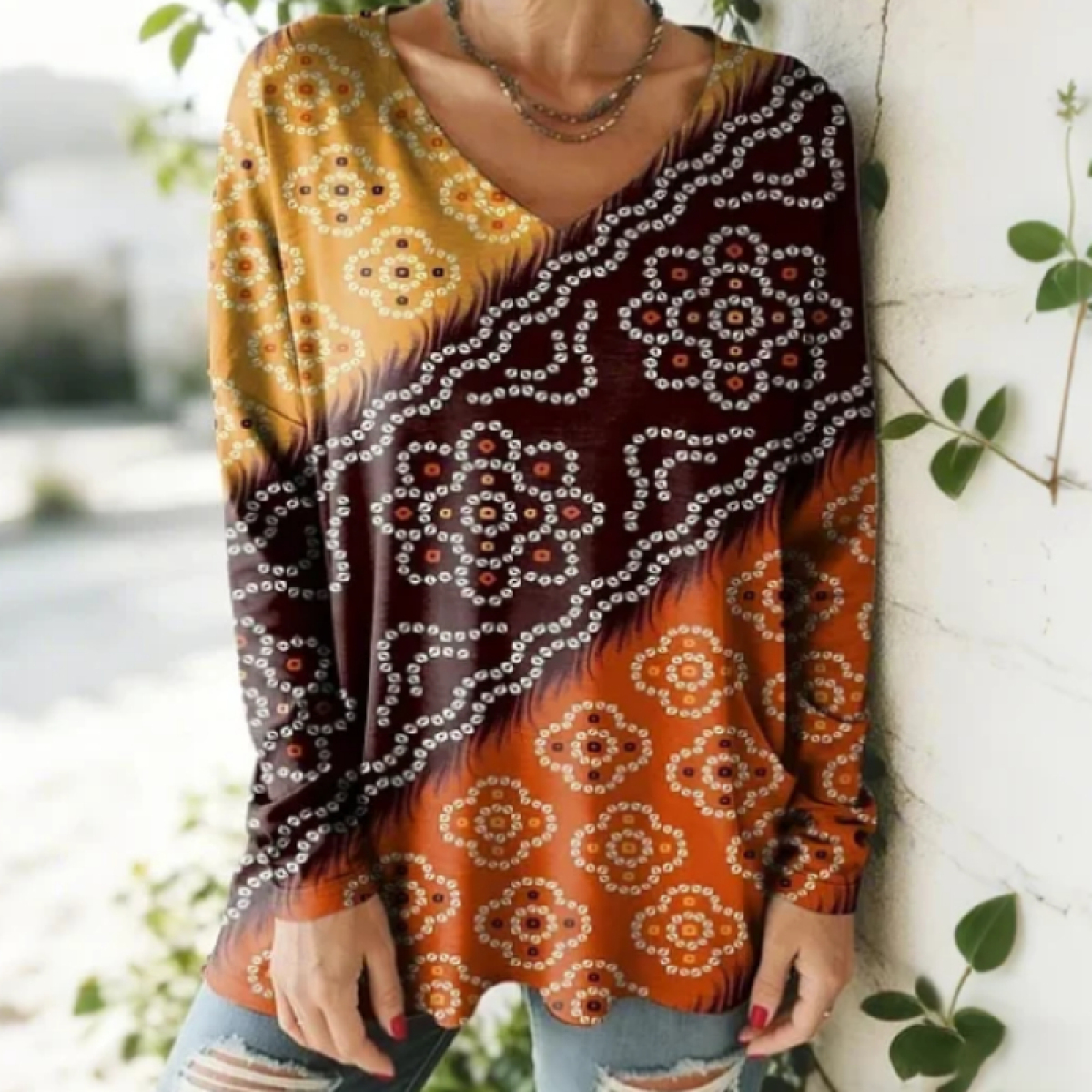 Women's Floral Pattern Art Print V-neck Casual Cotton T-shirt