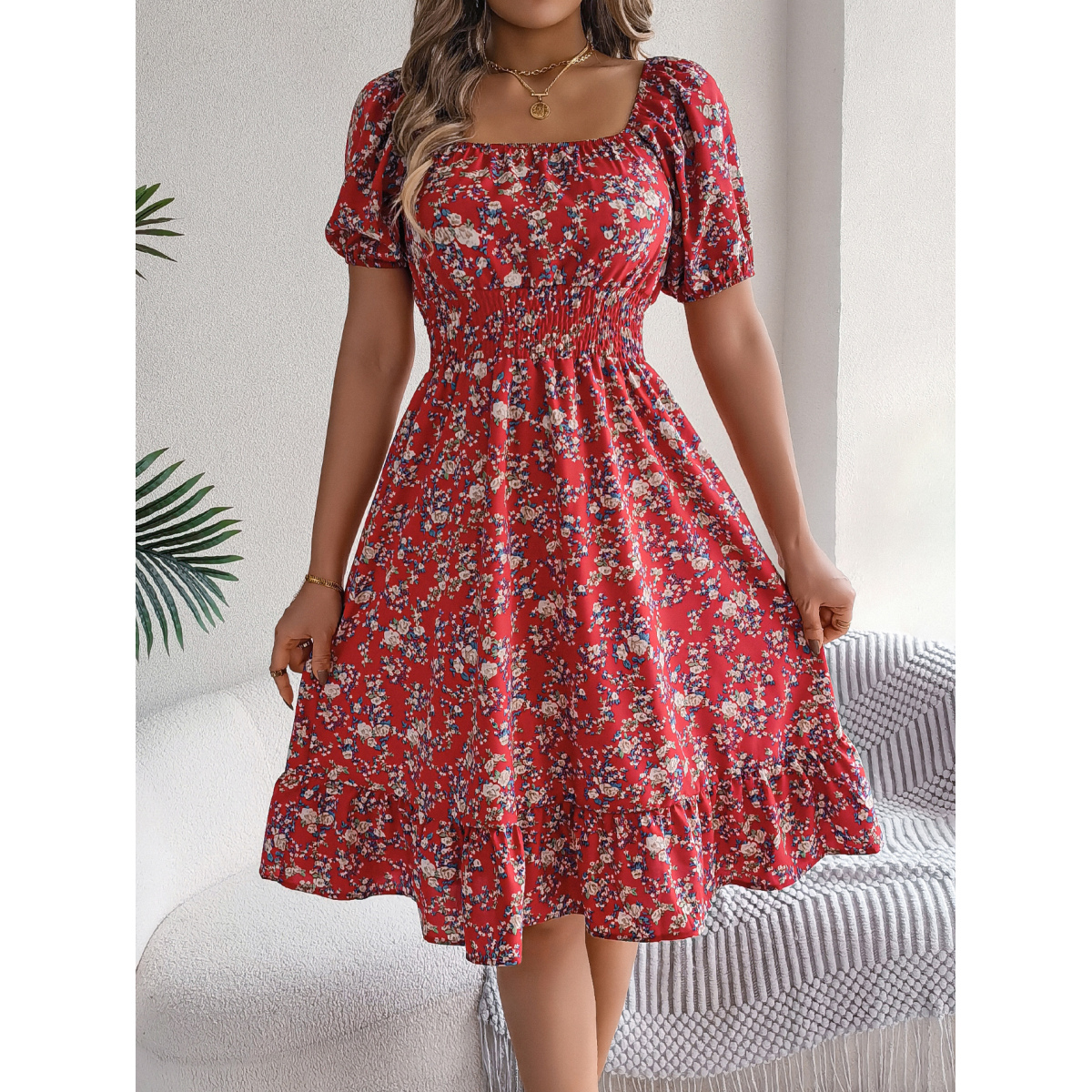 Women's Floral Print Square Neck Short Sleeve Tie Waist Ruffle A-Line Dress