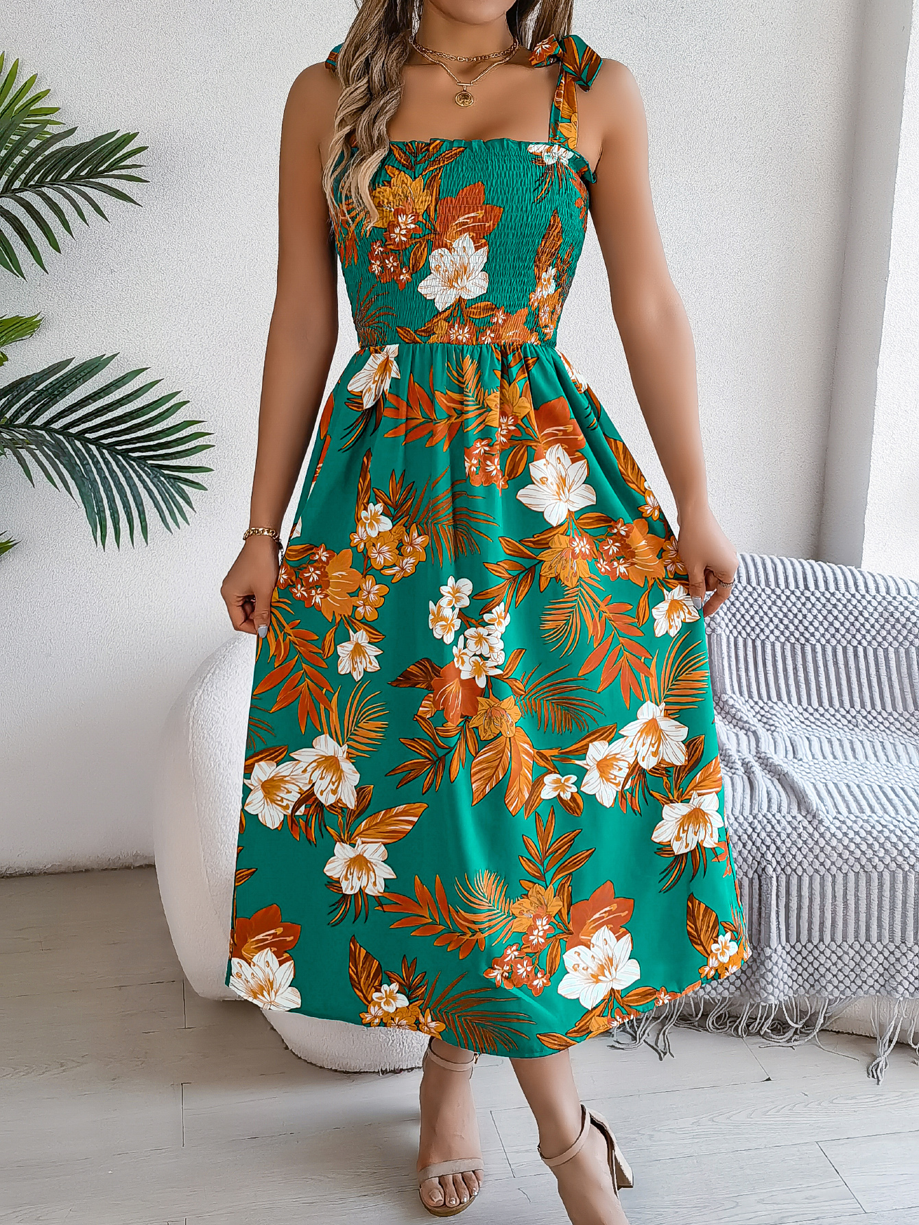Women's Floral Print Tie Waist Camisole Beach Vacation Maxi Dress