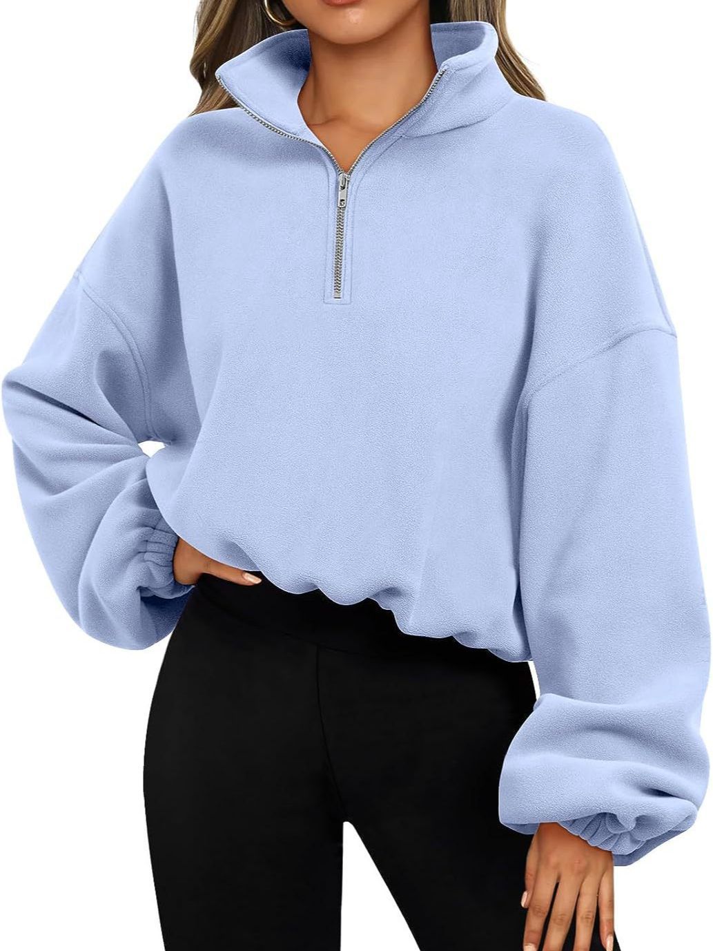 Women's Half Zipped Stand Collar Drawstring At Hem Polar Fleece Autumn Winter Sweater