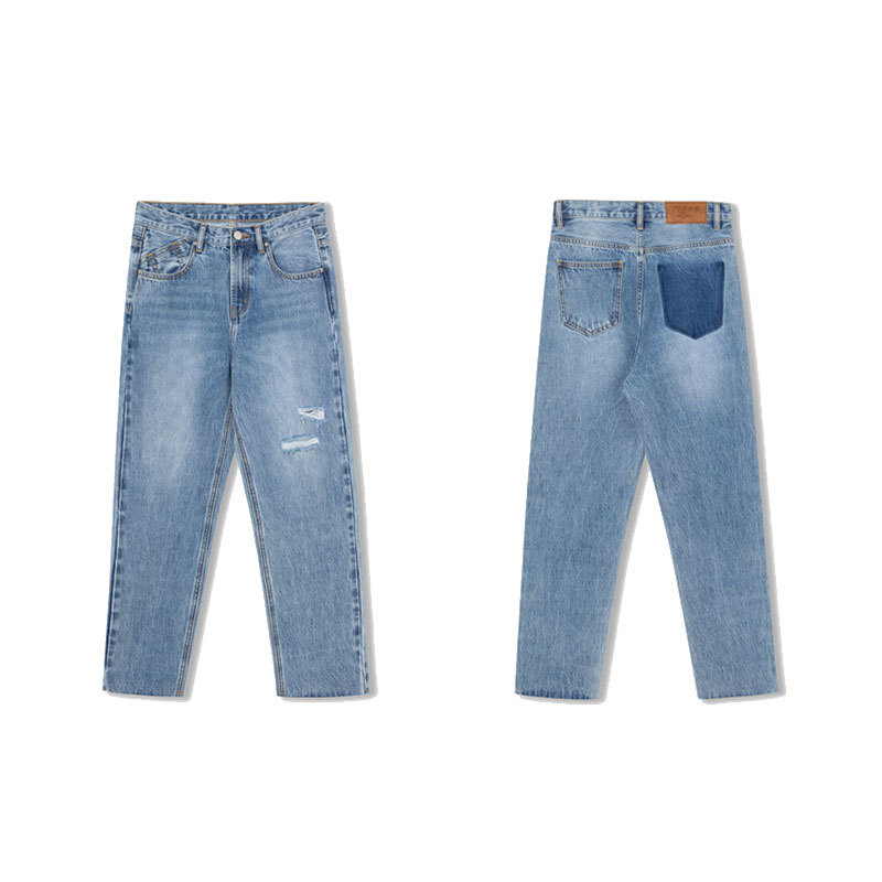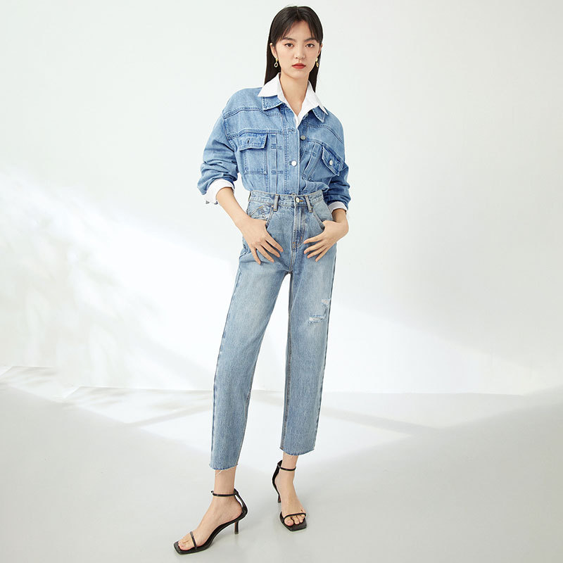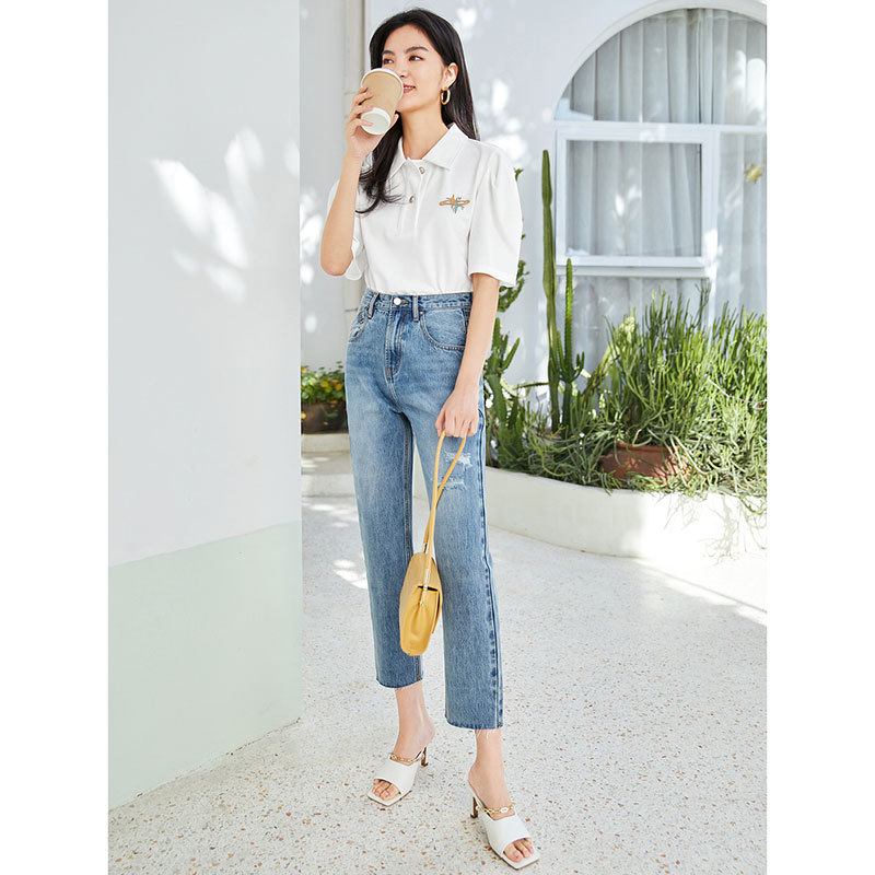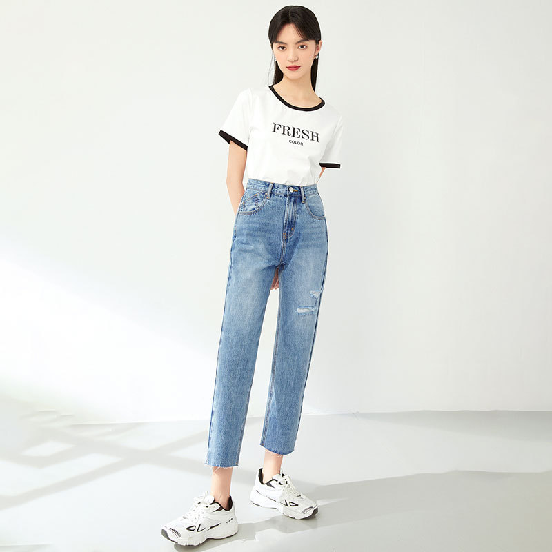 Women's High Waist Loose Straight Leg Pants Slimming Light Colored Jeans With Holes