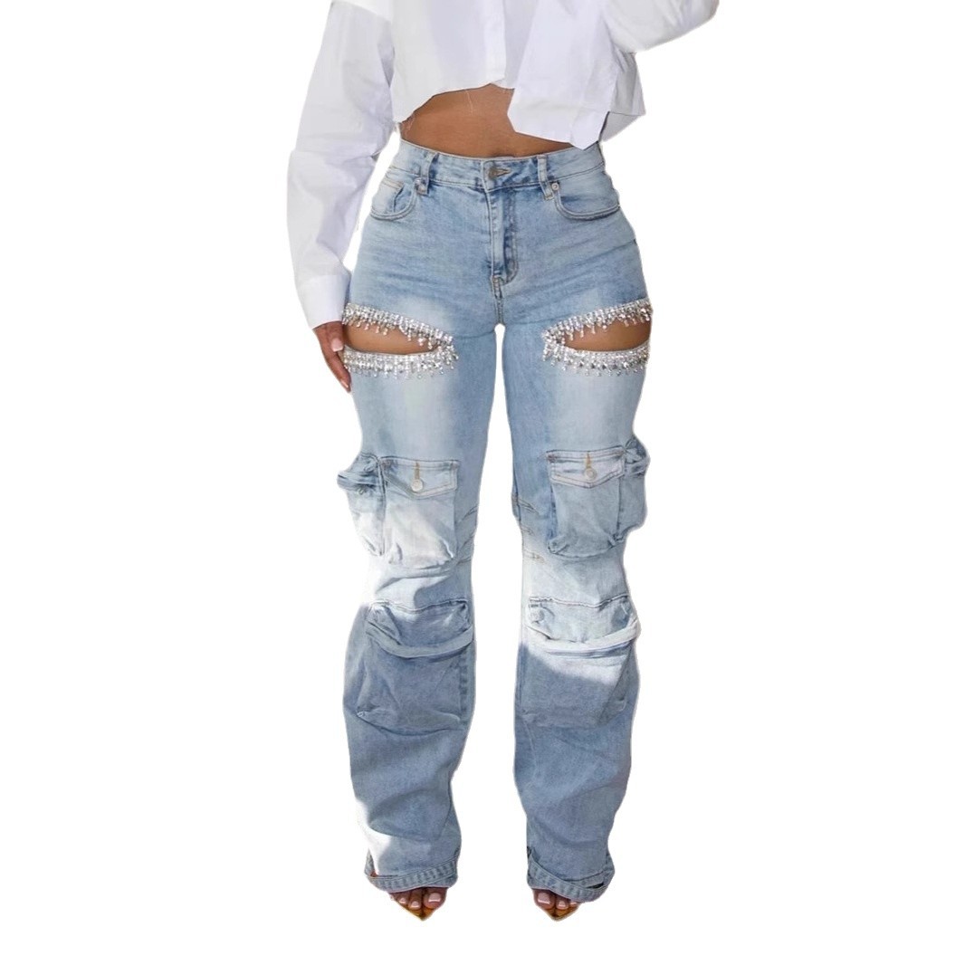 Women's Hollow-out Diamond Decorations Workwear Multi-pocket Stretch Jeans