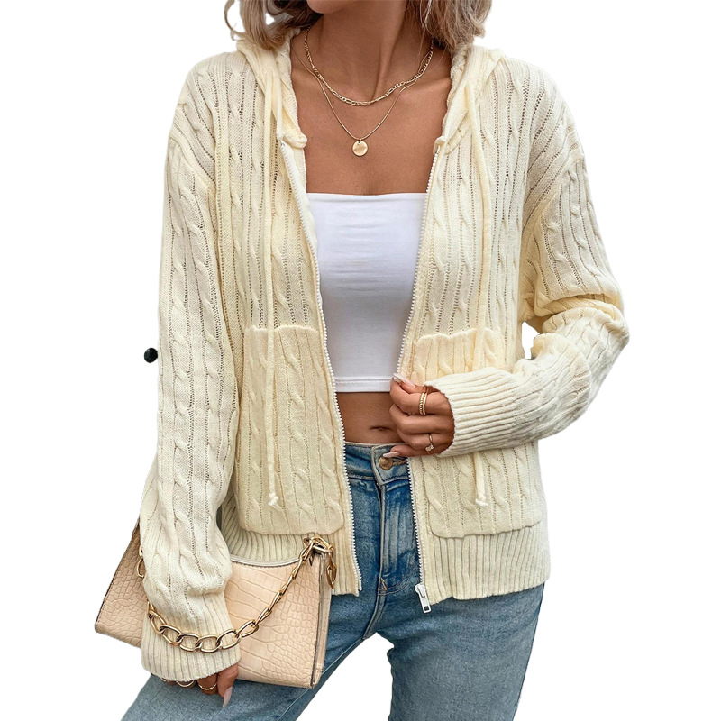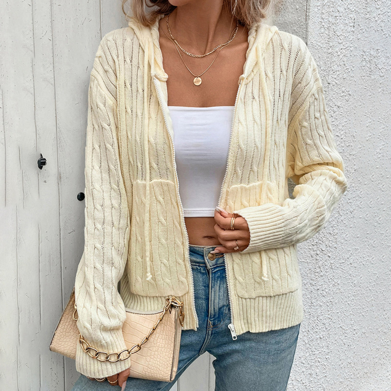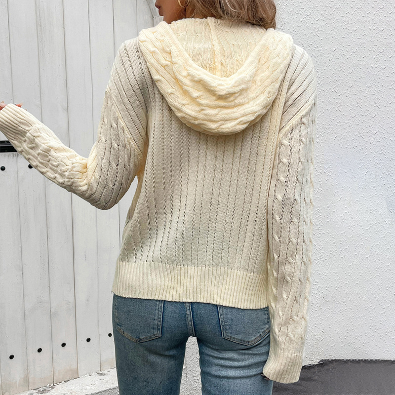 Women's Hooded Twisted Solid Color Sweater Cardigan