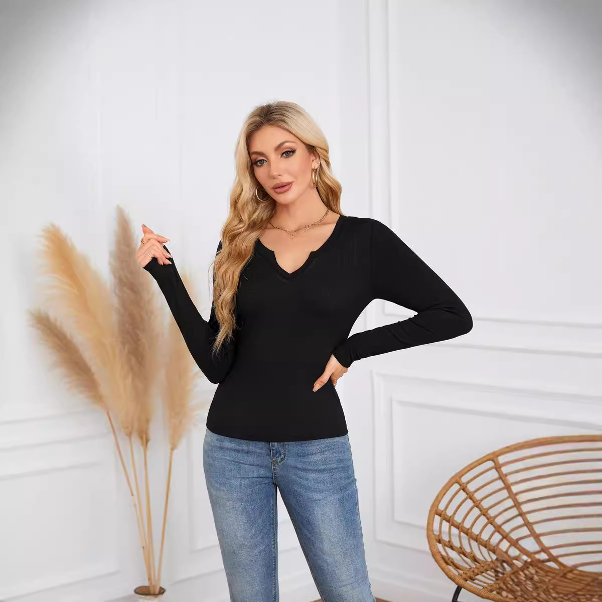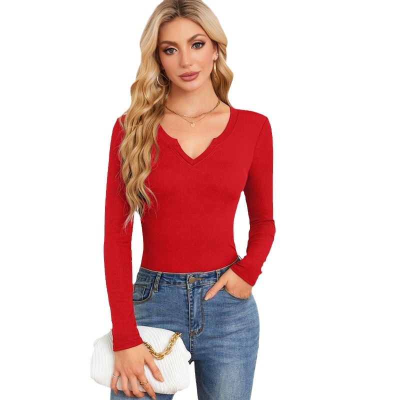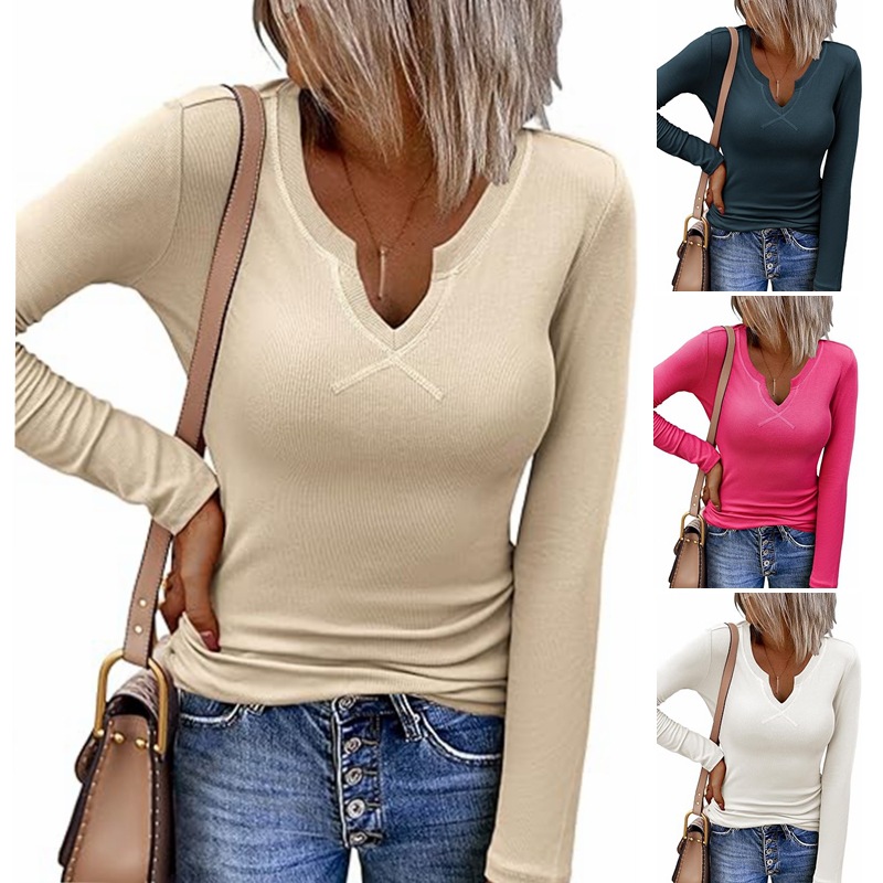 Women's Hot Sunken Stripe Deep U Crisscross Neckline Long-sleeved T-shirt Top