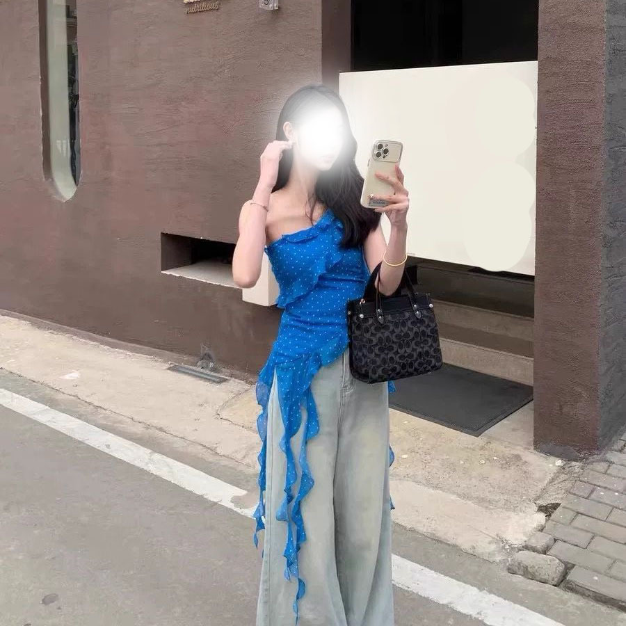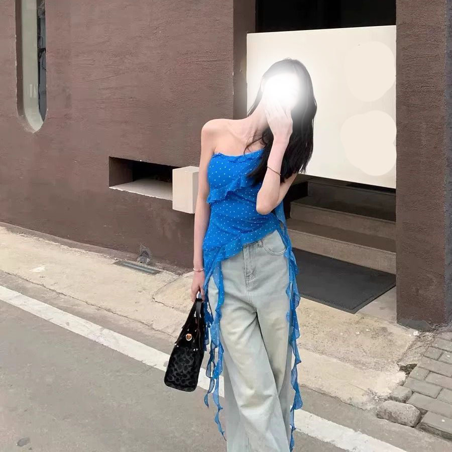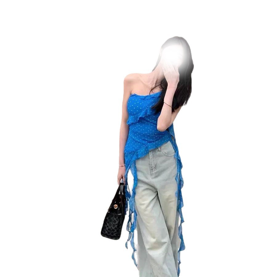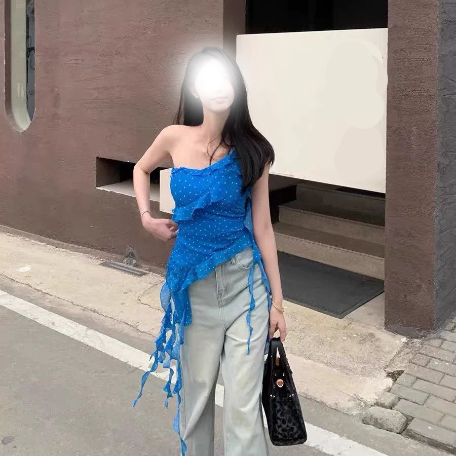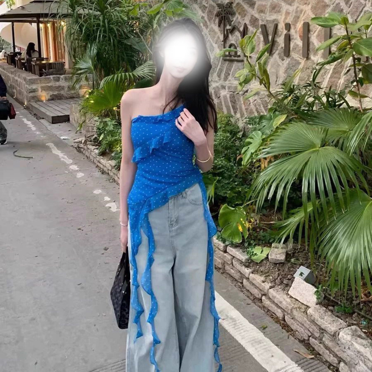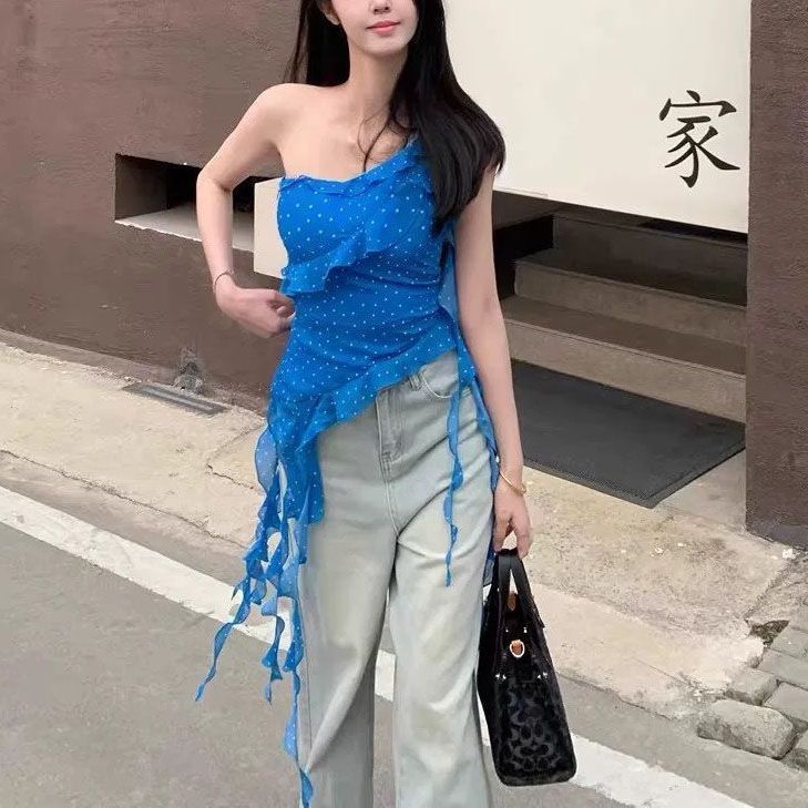 Womens Irregular Blue Polka-Dot Off-Shoulder Tank Top