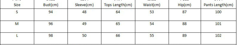 Front length 59, back length 62, sleeve length 41, chest size 104, pant length 99