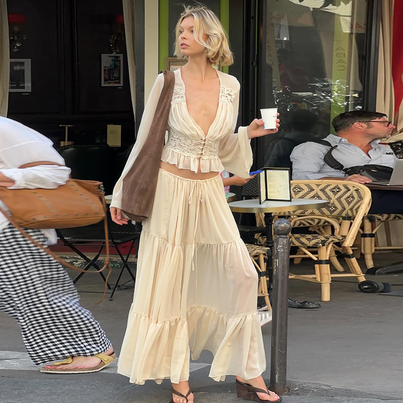 Womens Lace Chiffon Cardigan Top And Loose Long Skirt Set