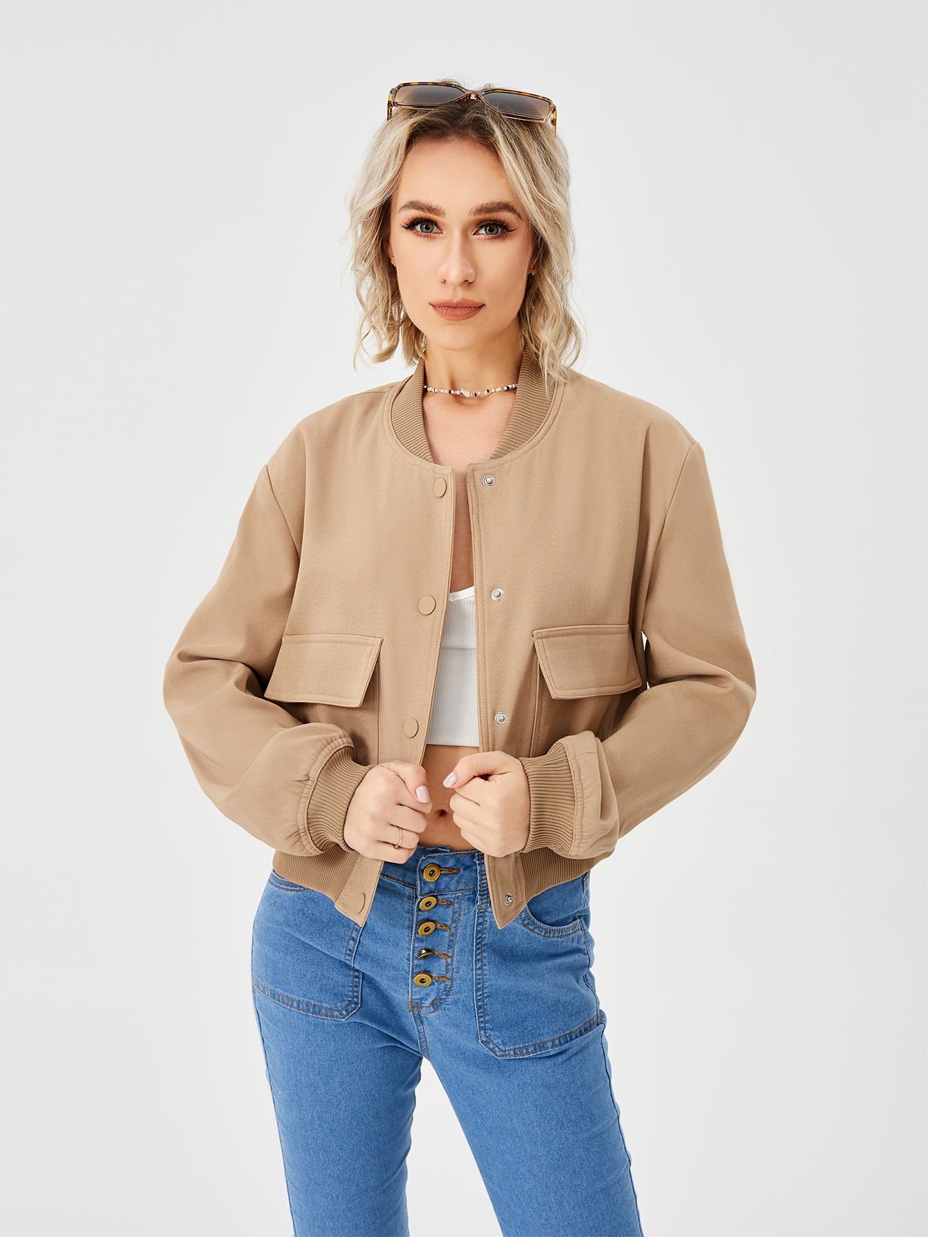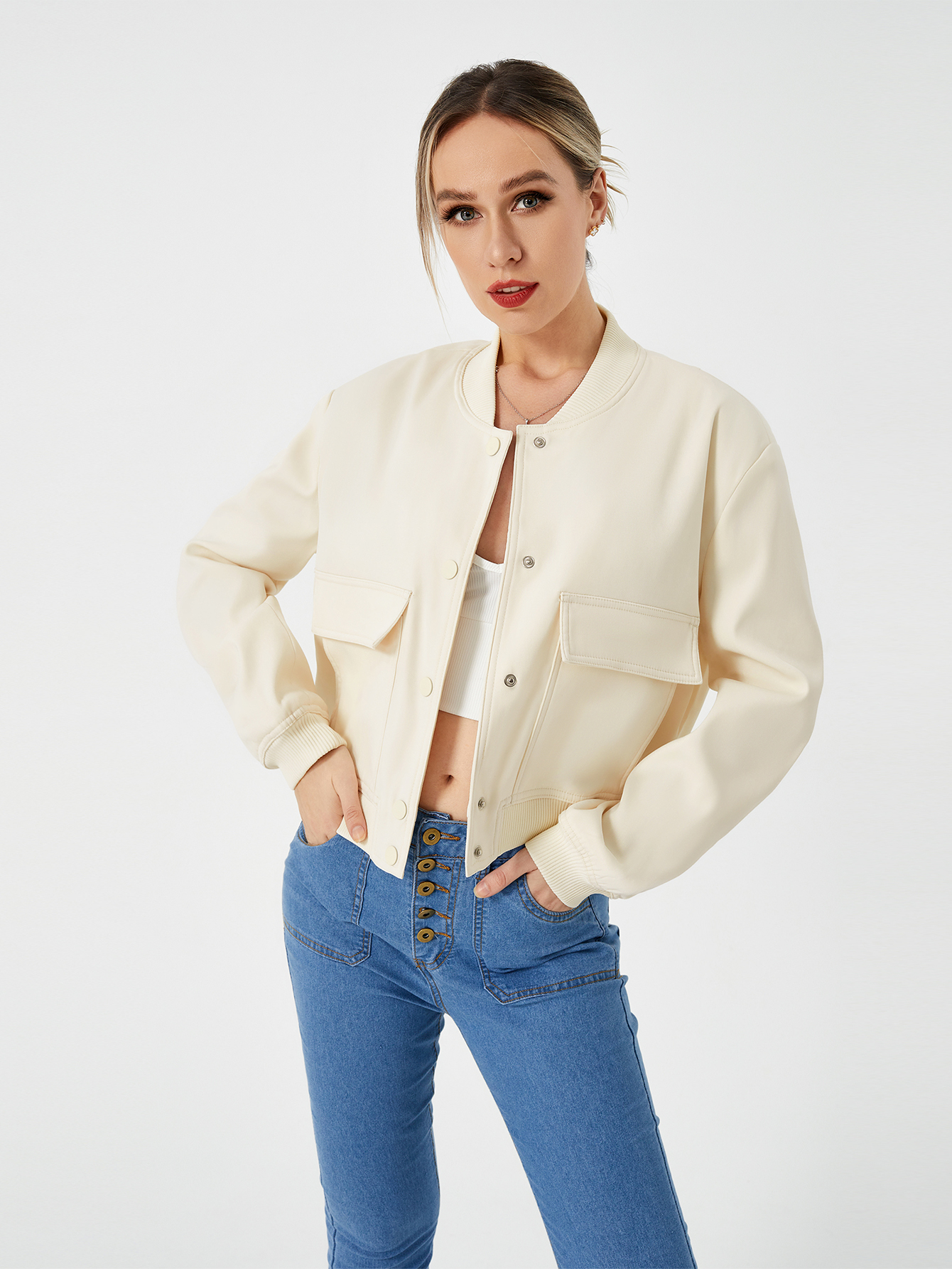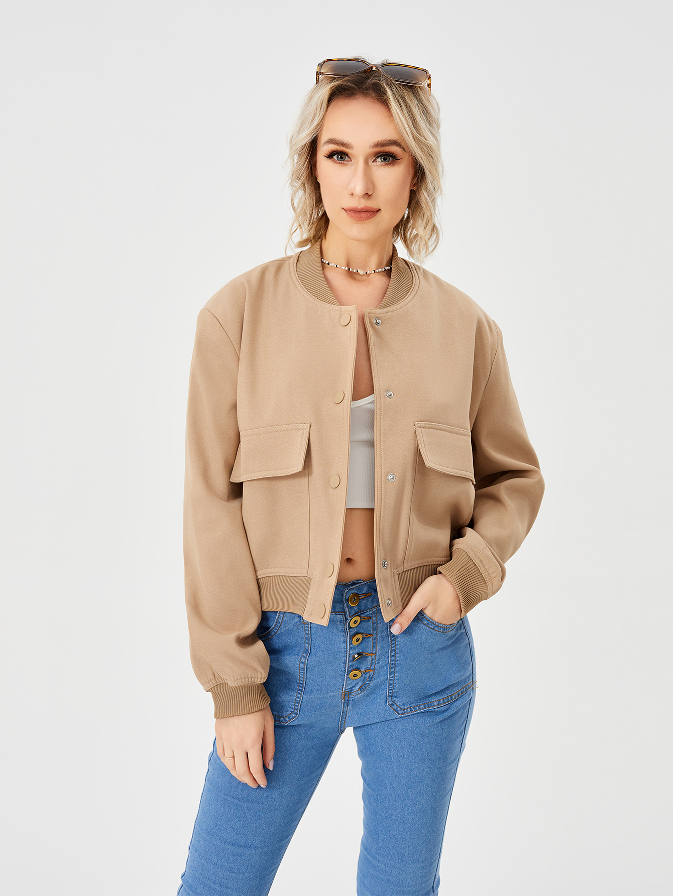Unique design: cropped length shacket jacket,casual style, Invisible snap button, stand-up collar,two flap pockets, elastic hem and cuff, fashion simple design for cool girl