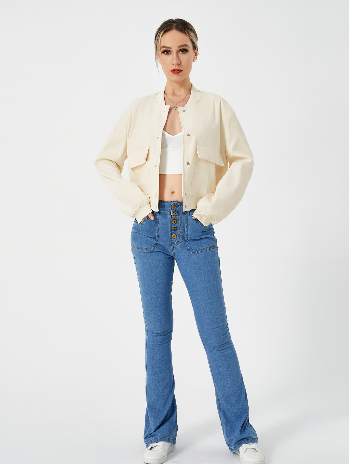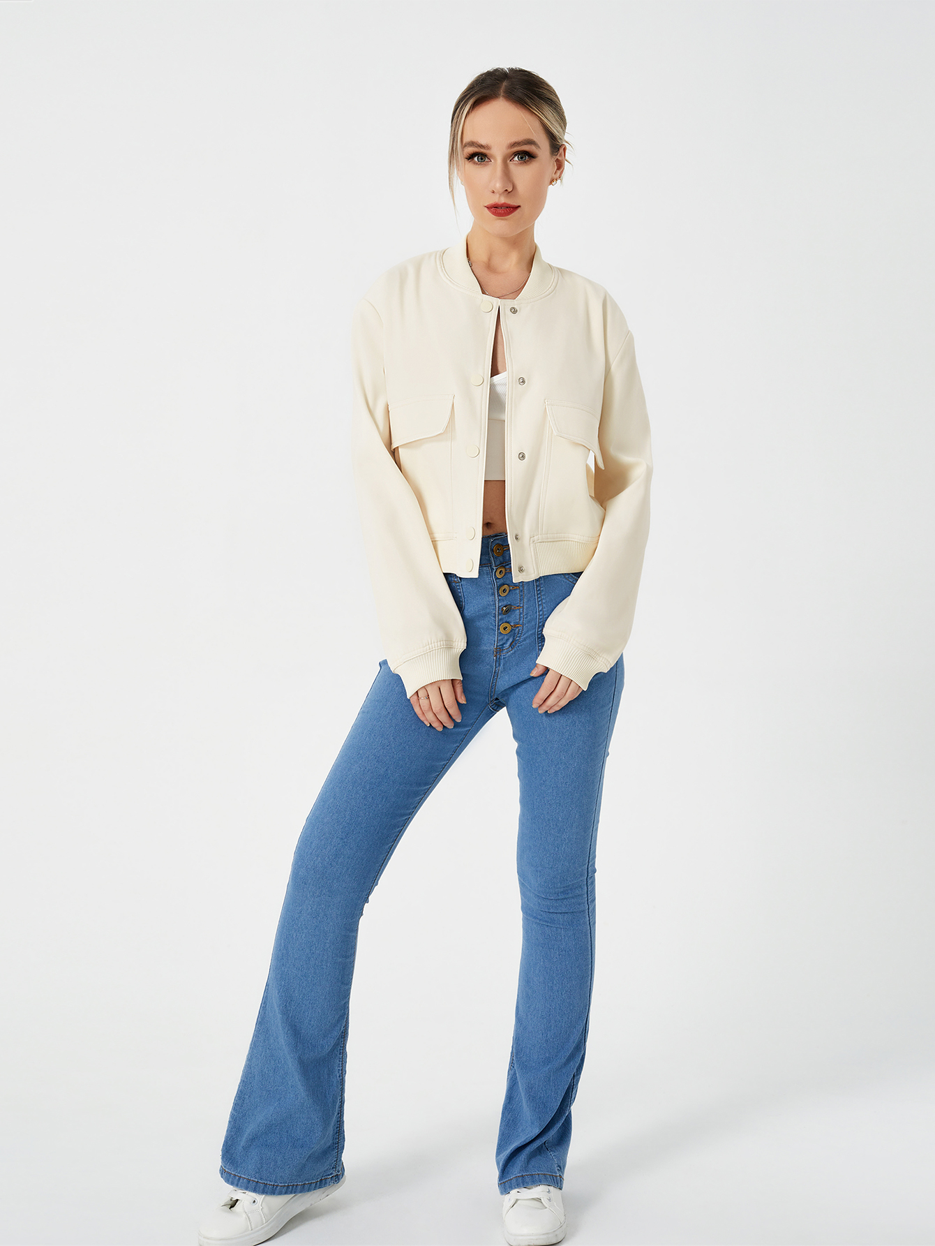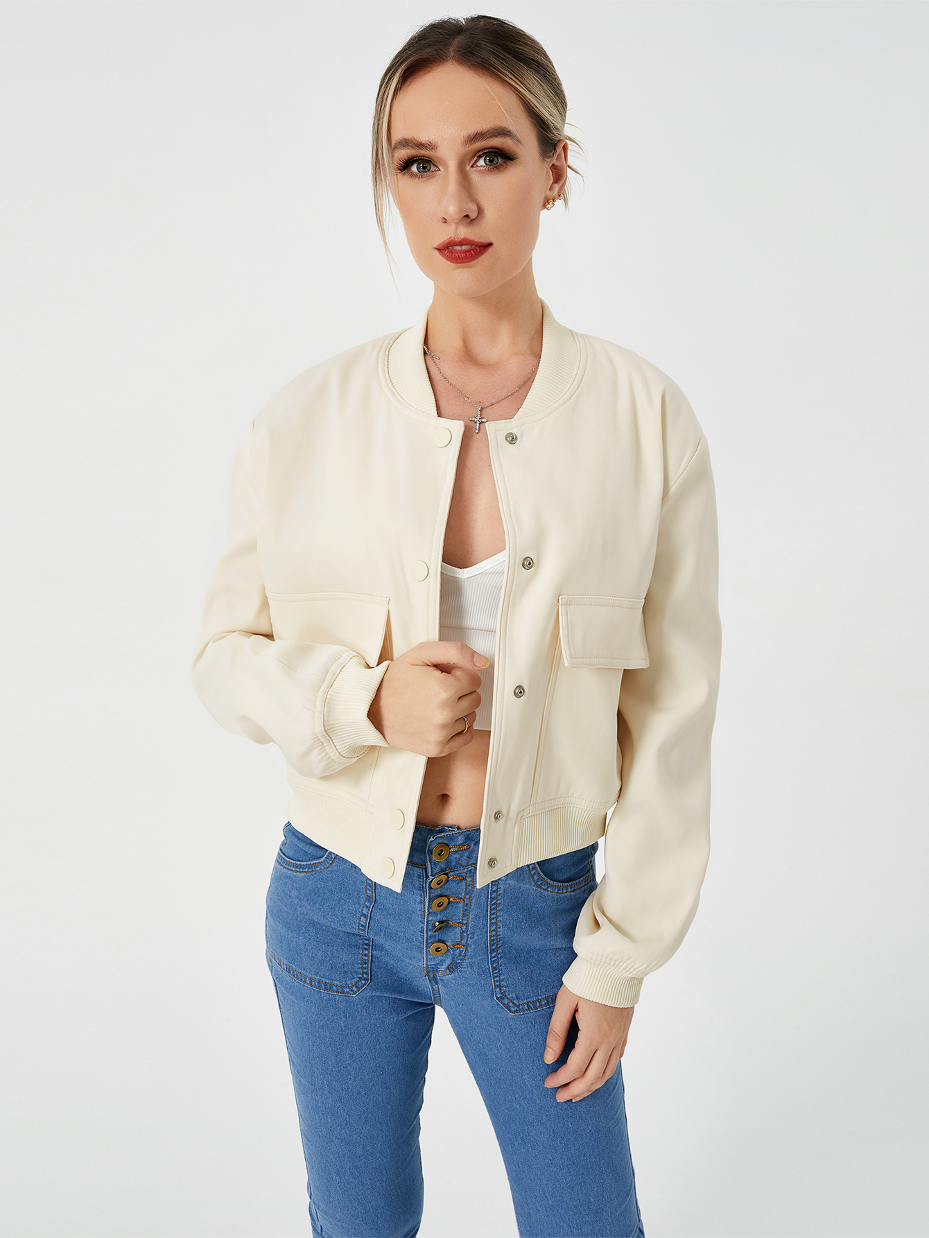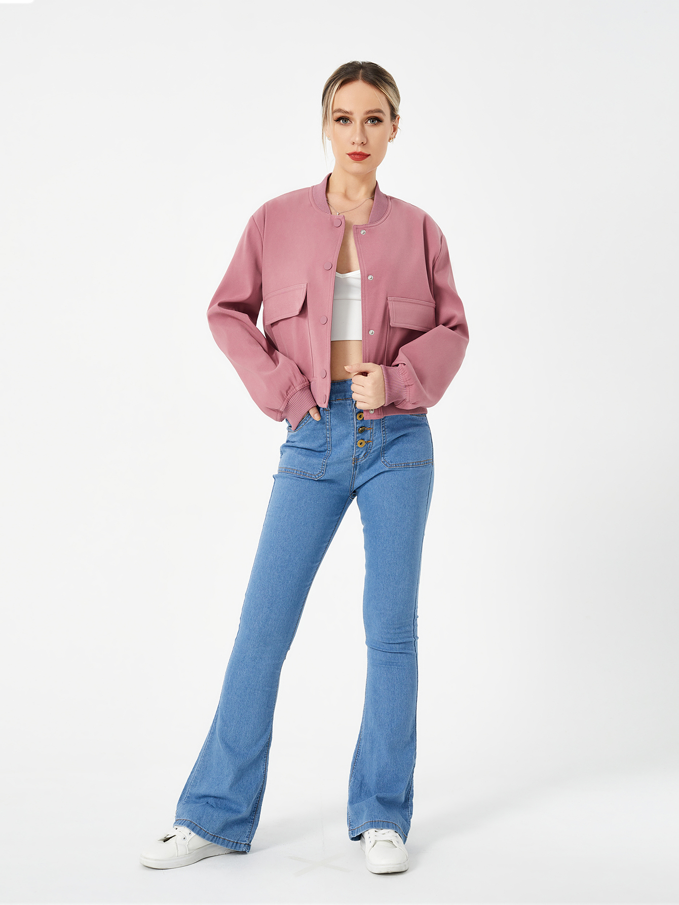 Unique design: cropped length shacket jacket,casual style, Invisible snap button, stand-up collar,two flap pockets, elastic hem and cuff, fashion simple design for cool girl