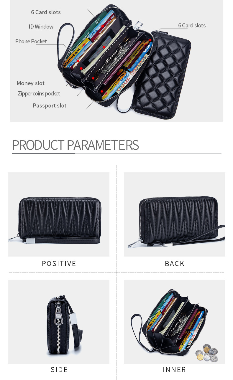 The internal structure of the small bag: dark compartment, banknote clip, photo position, change position, passbook position, zipper position, ID position, card position, key position, check position, passport position