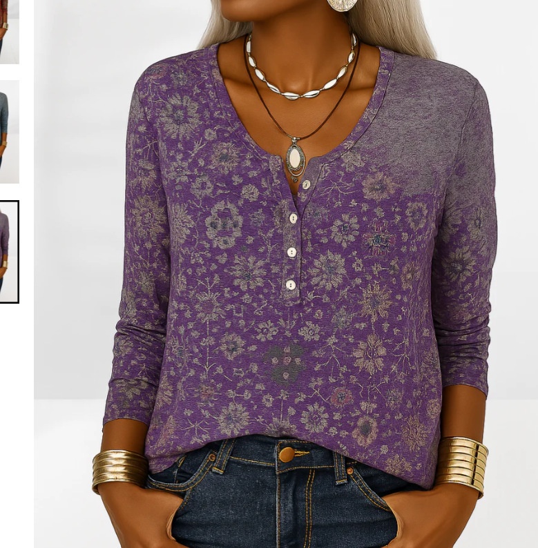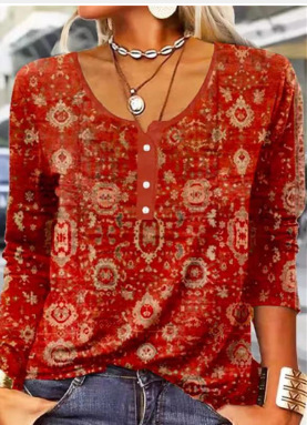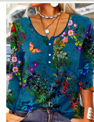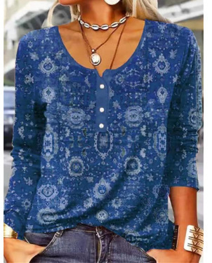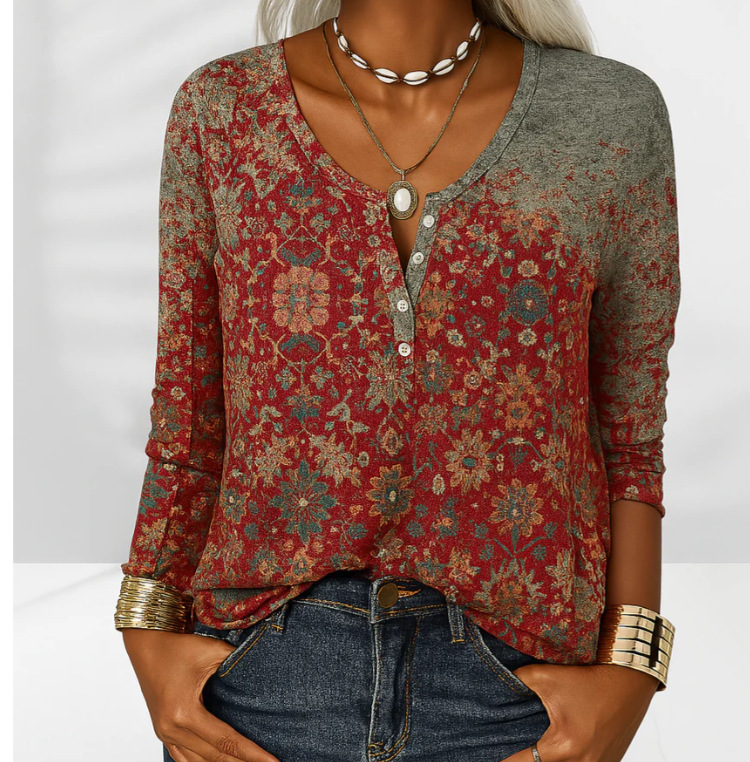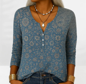 Women's Long-Sleeve Printed V-Neck Loose T-Shirt