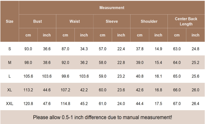 1. Asian sizes are 1 to 2 sizes smaller than European and American people. Choose the larger size if your size between two sizes. Please allow 2-3cm differences due to manual measurement. 2. Please check the size chart carefully before you buy the item, if you don't know how to choose size, please contact our customer service. 3.As you know, the different computers display colors differently, the color of the actual item may vary slightly from the following images.