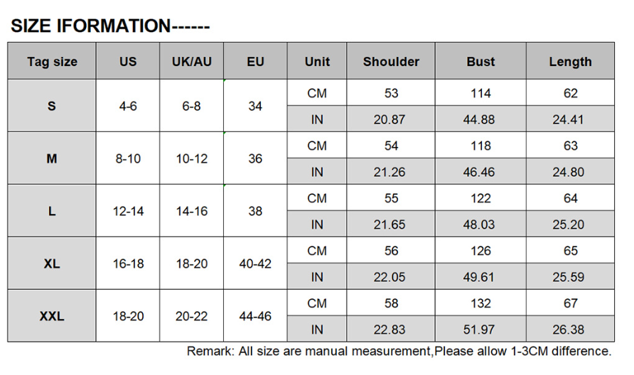 1. Asian sizes are 1 to 2 sizes smaller than European and American people. Choose the larger size if your size between two sizes. Please allow 2-3cm differences due to manual measurement. 2. Please check the size chart carefully before you buy the item, if you don't know how to choose size, please contact our customer service. 3.As you know, the different computers display colors differently, the color of the actual item may vary slightly from the following images.