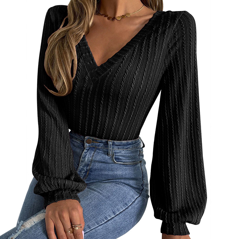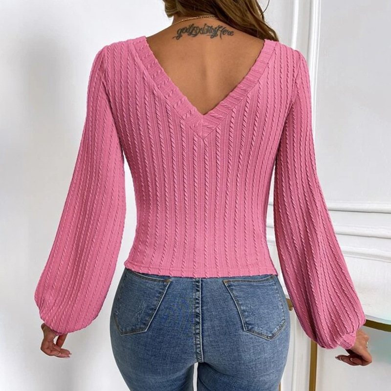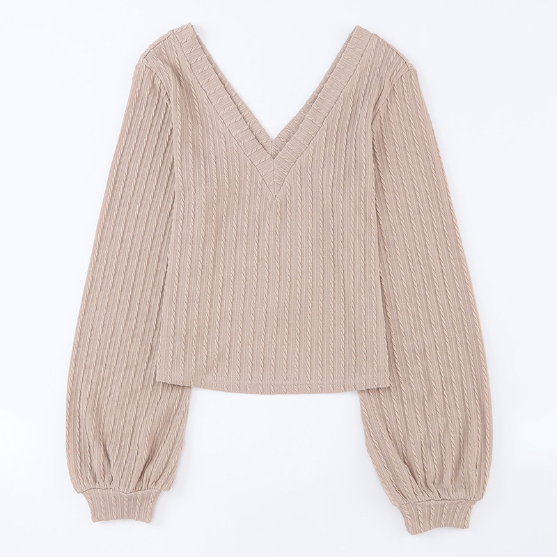 Popular elements: knitted jacquard texture fabric lantern sleeve V-neck knitted top