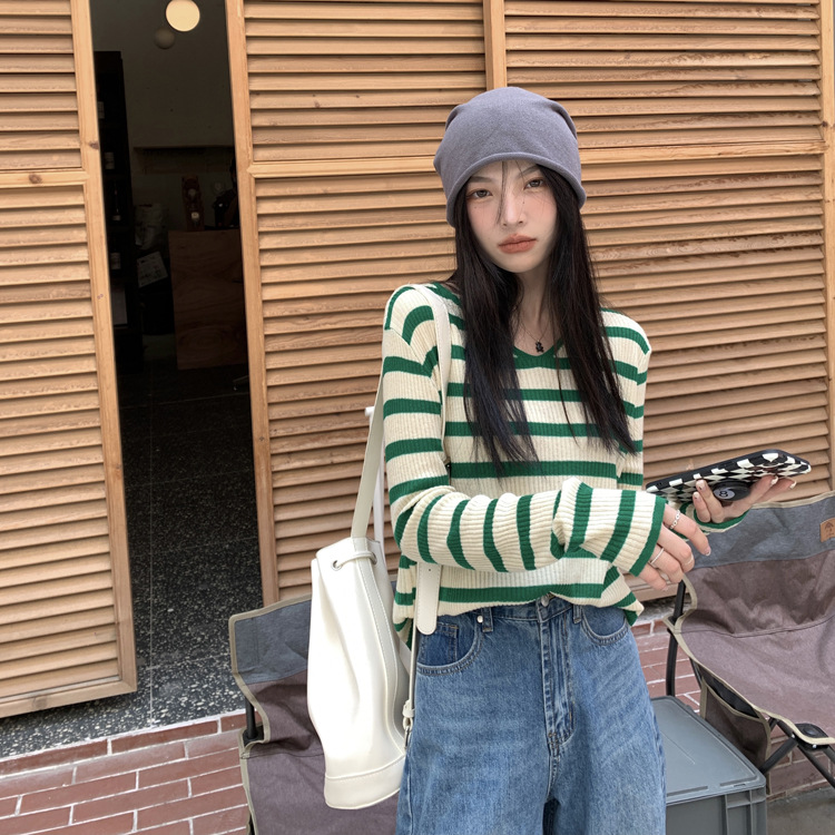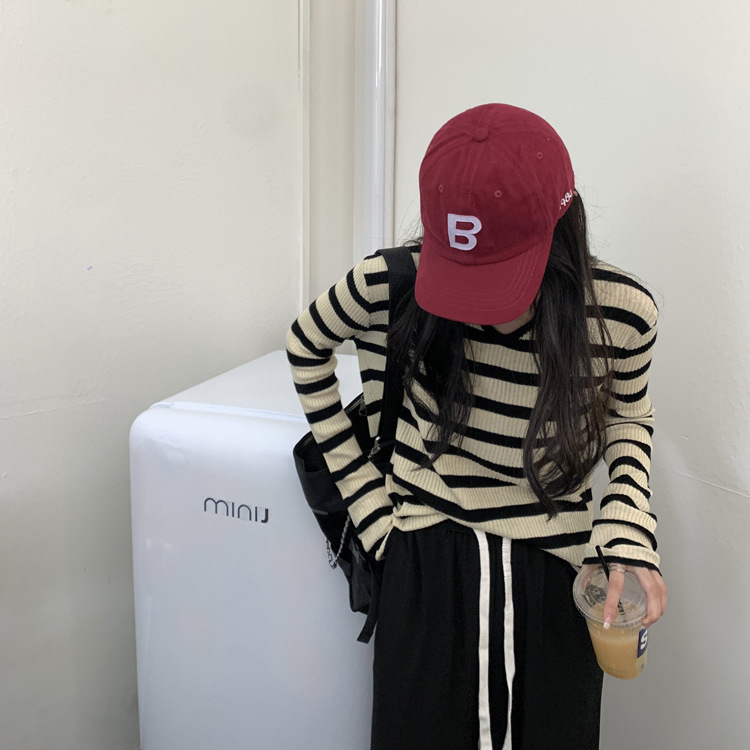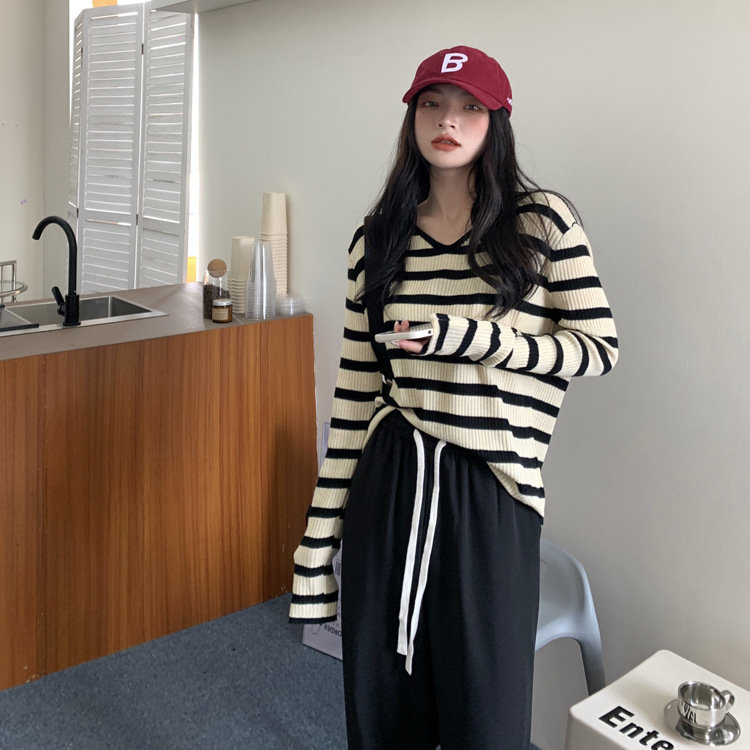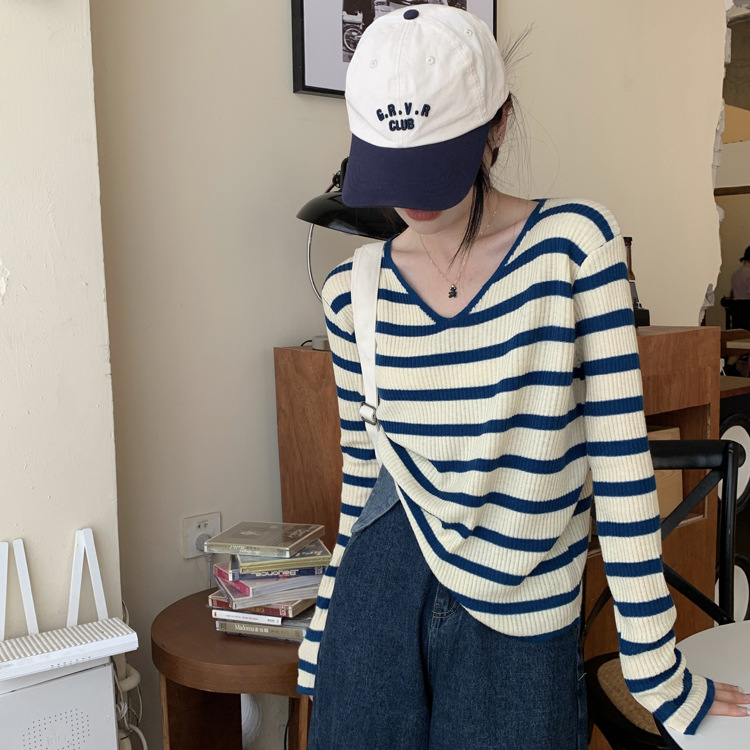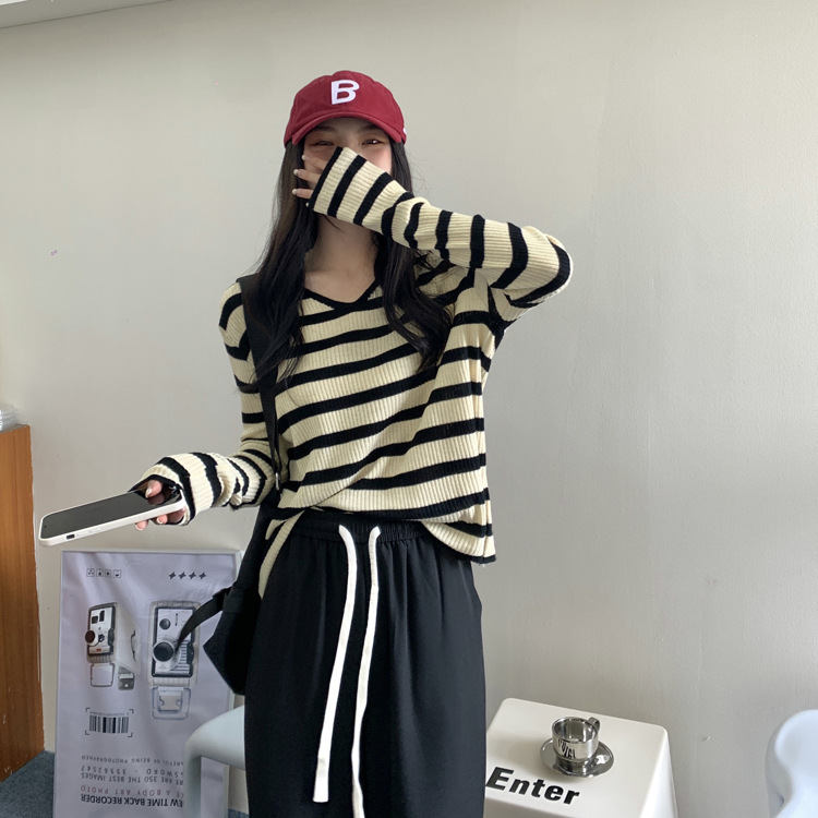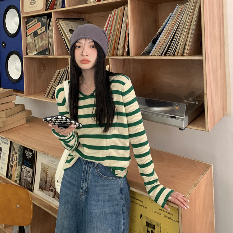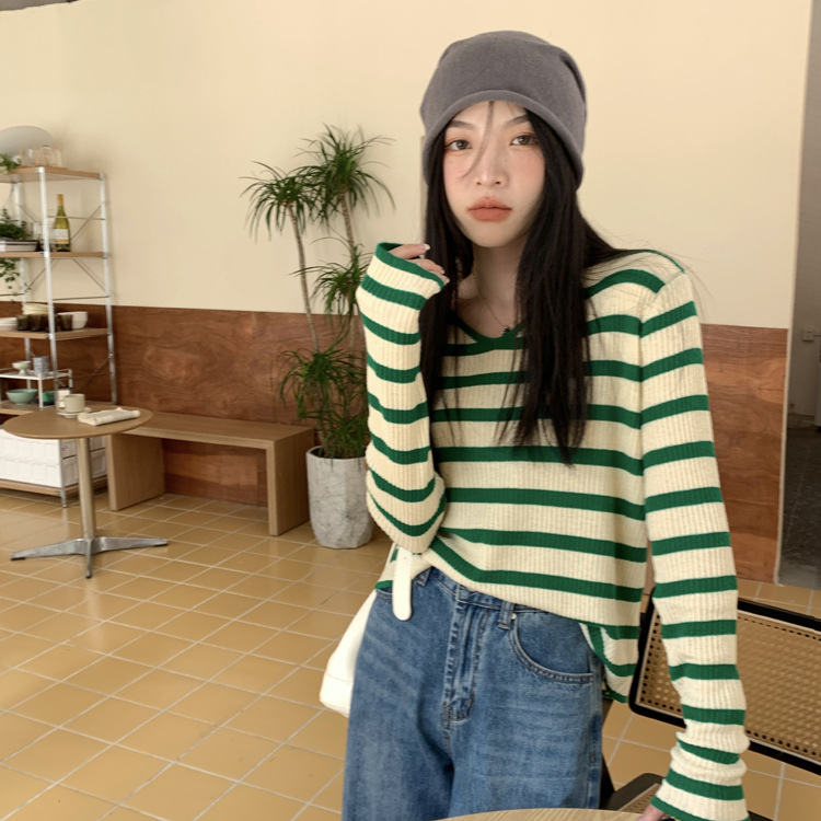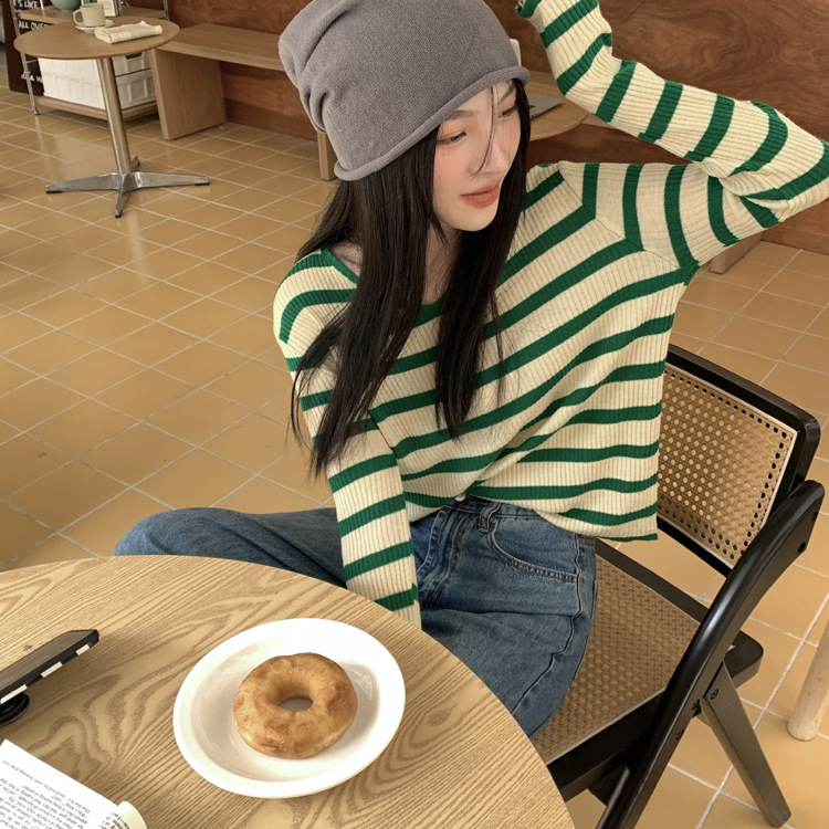 Women's Long-sleeved T-shirt Sunken Stripe Threaded Undershirt Top