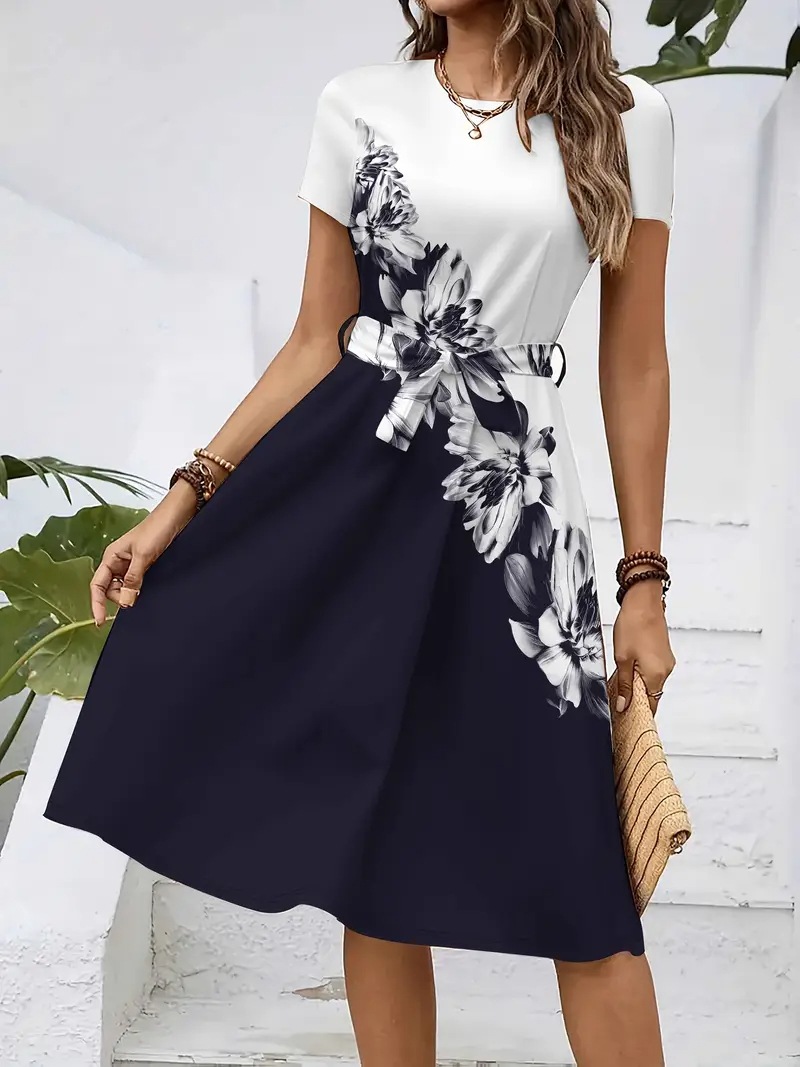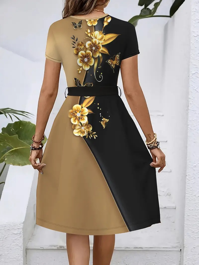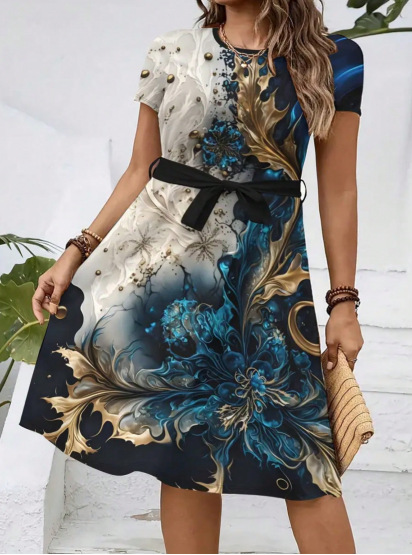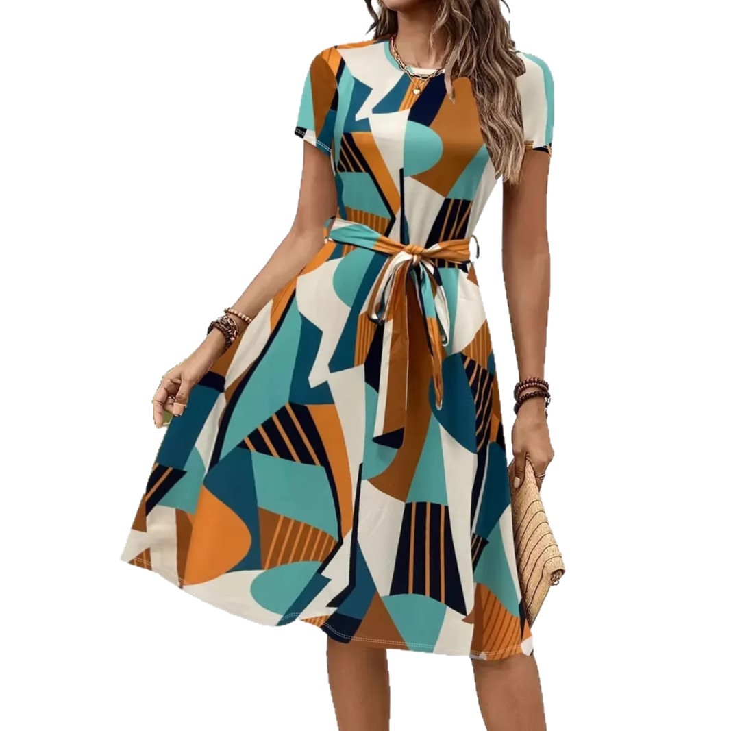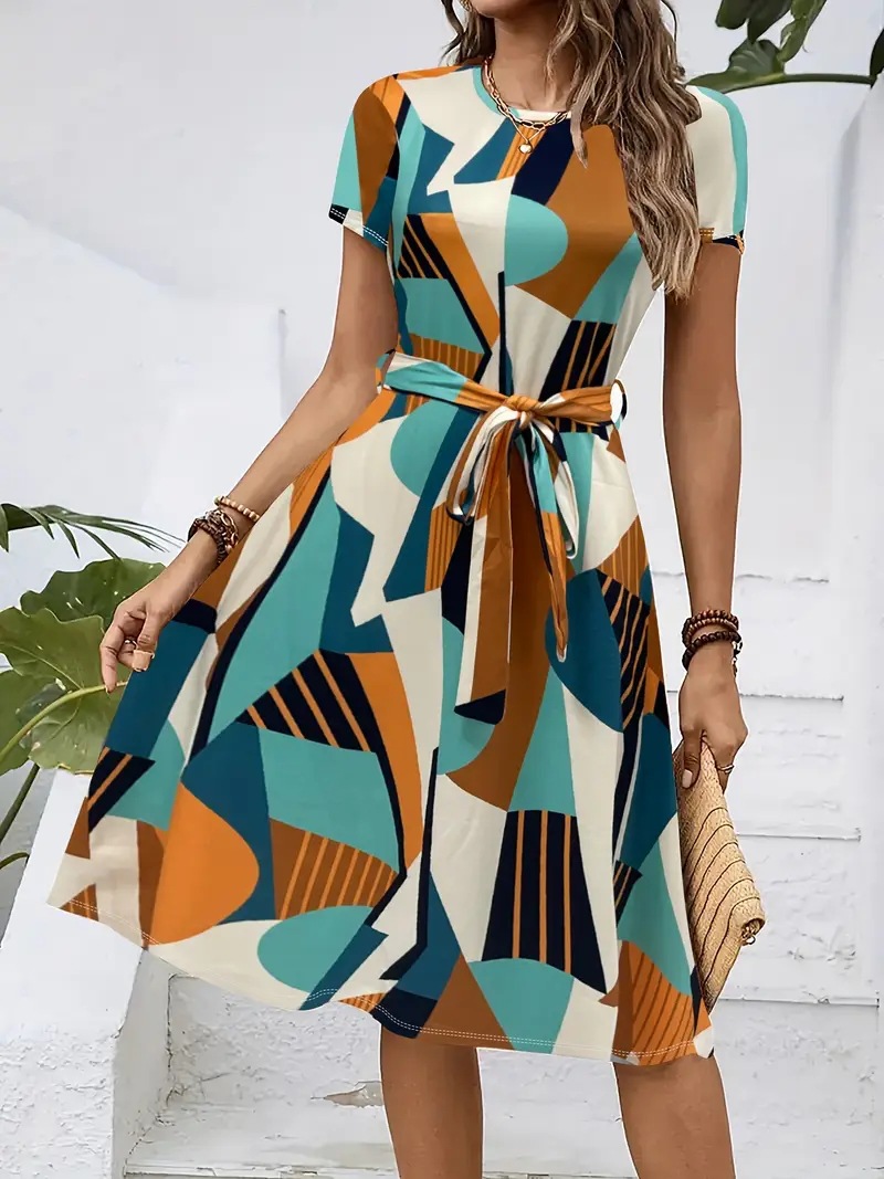 Womens Loose-fitting Dress With Short Sleeves A Crew Neck And A Belt