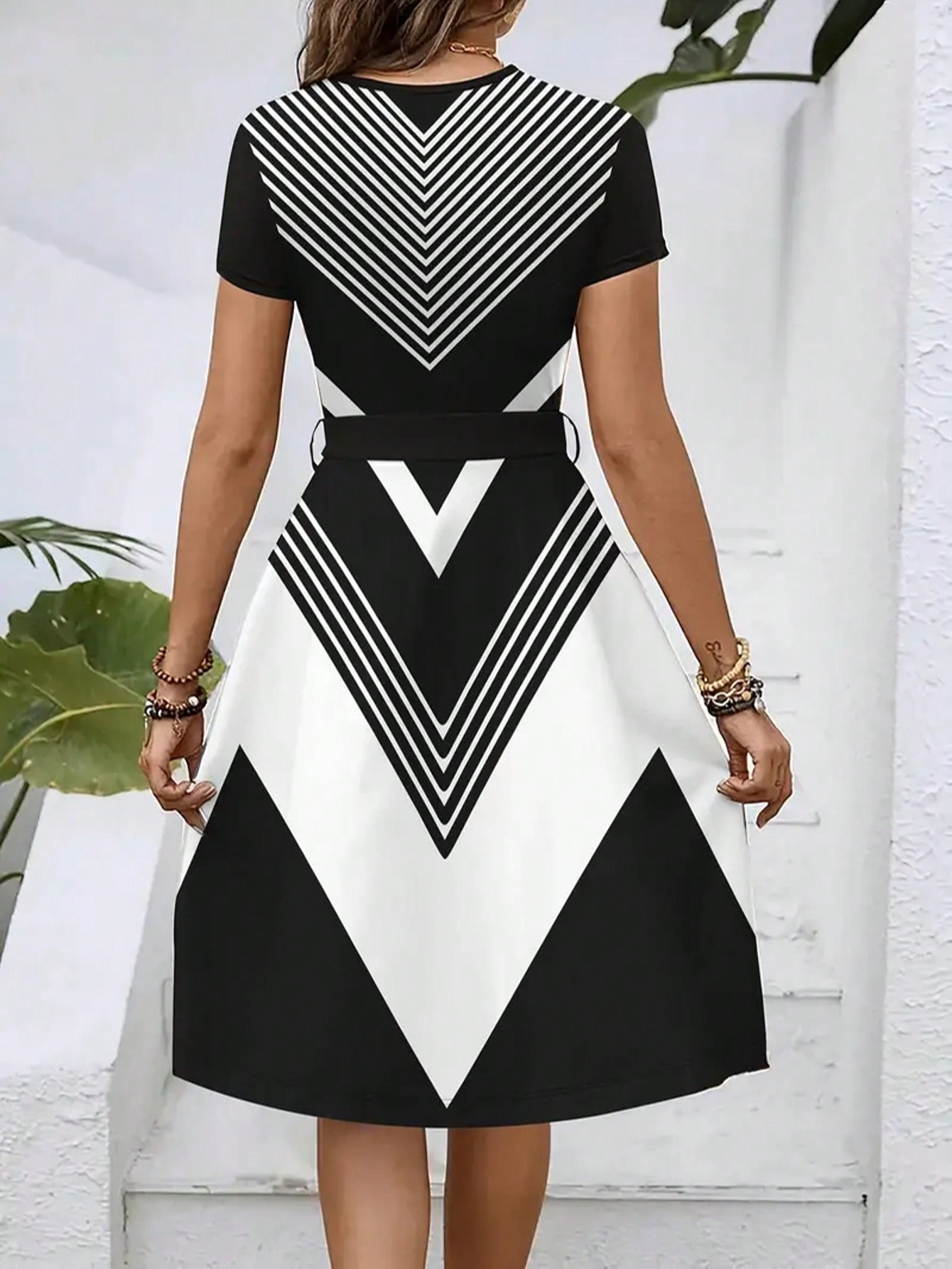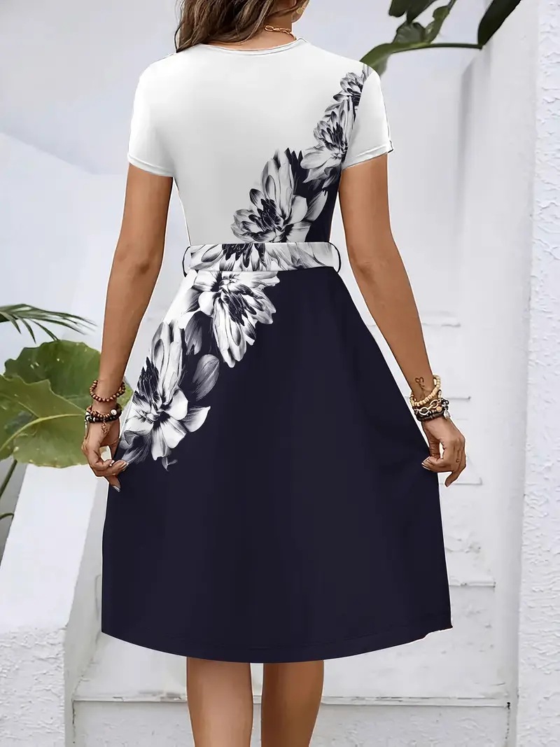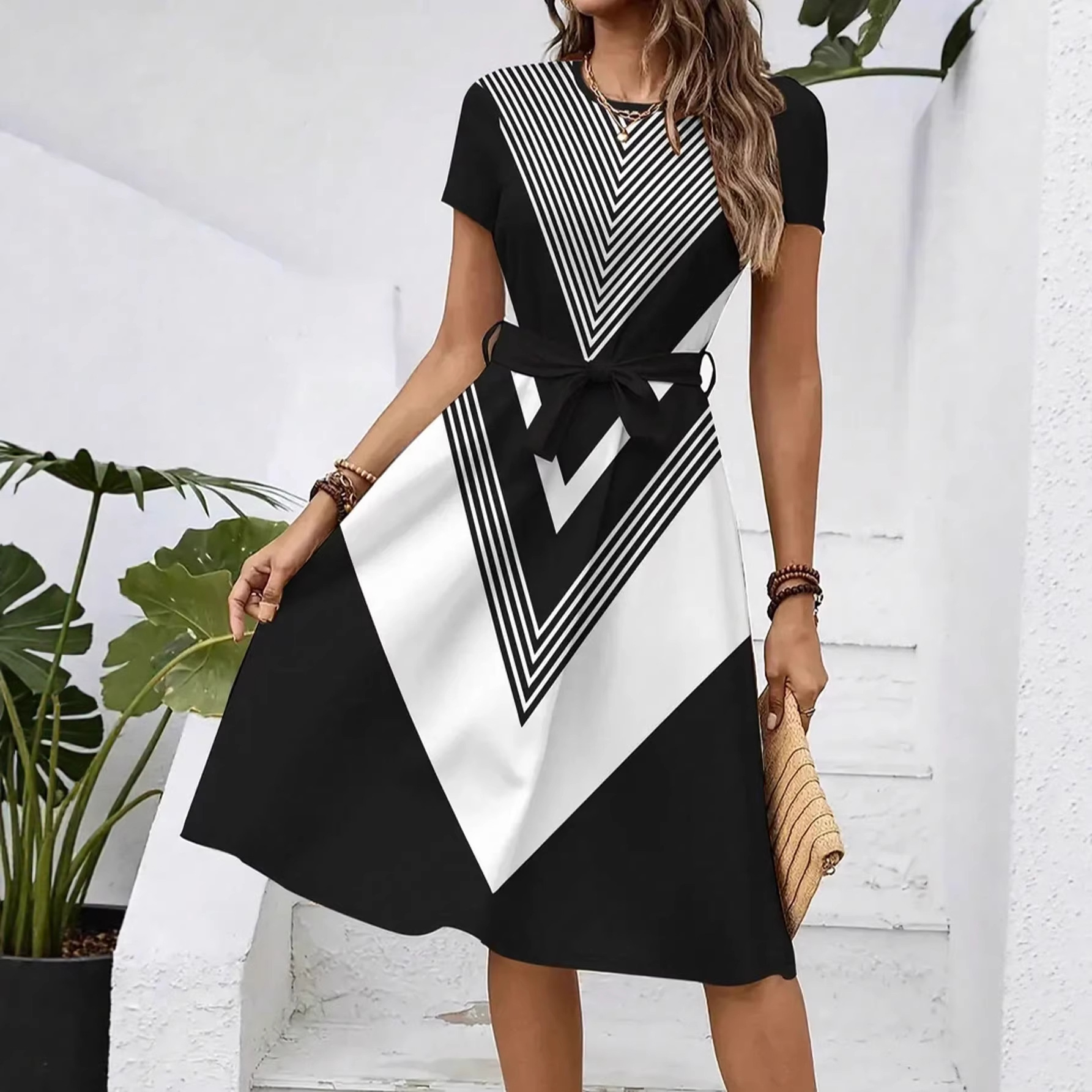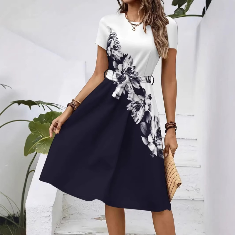 Womens Loose-fitting Dress With Short Sleeves A Crew Neck And A Belt