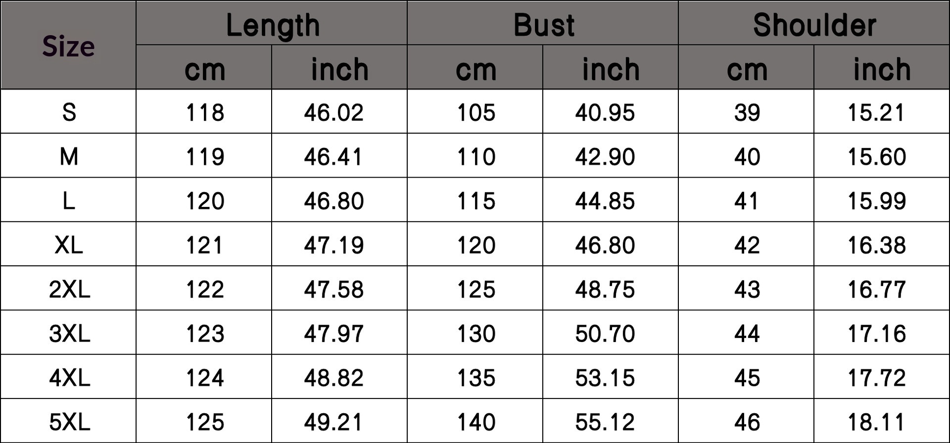 Sizes: S, M, L, XL, 2XL, 3XL, 4XL, 5XL