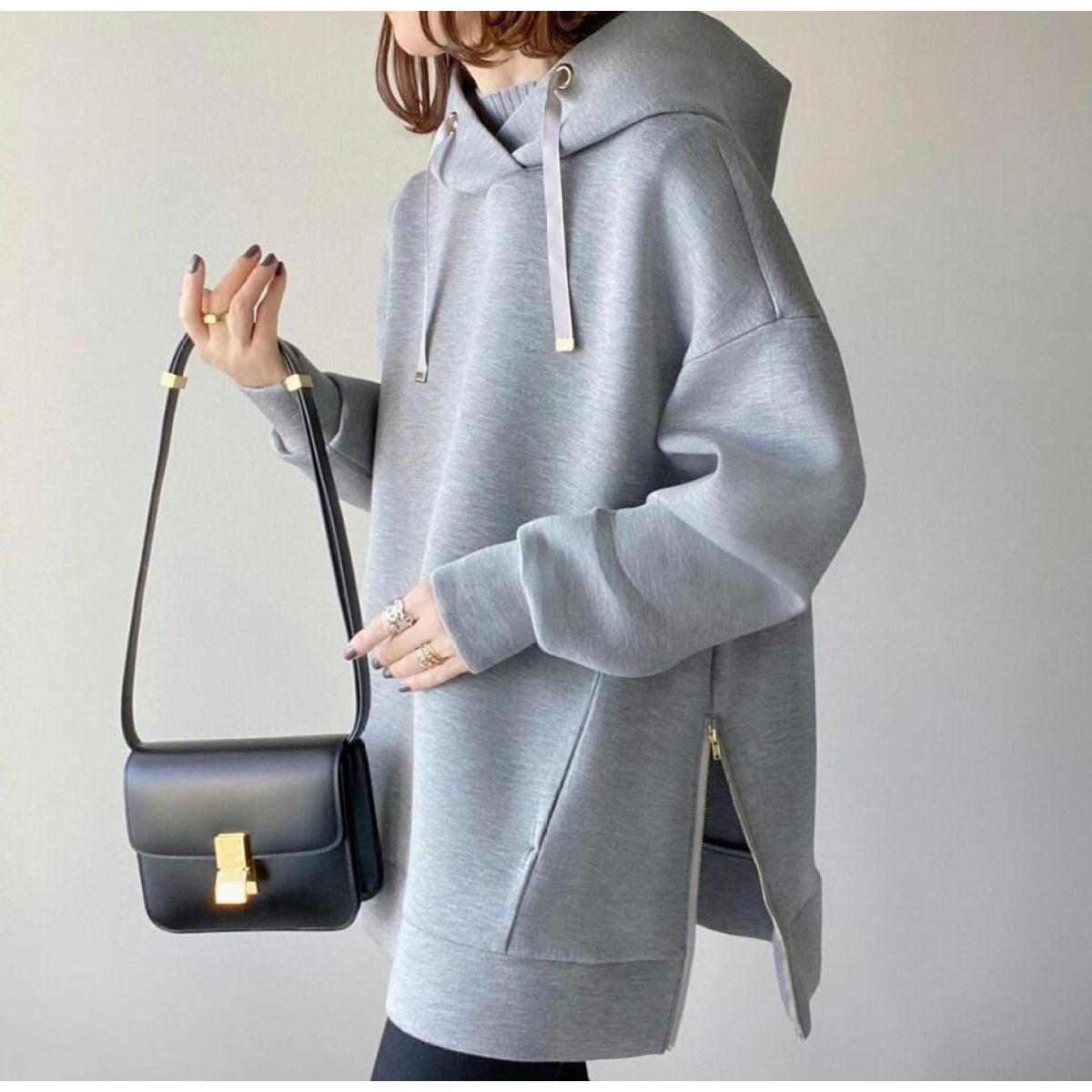 Women's Loose Slimming Hooded Solid Color Side Zipper Sweater