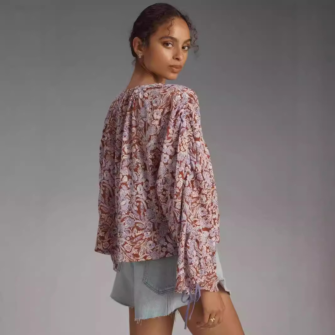 Women's Loose V-neck Pullover Casual Long Sleeve Floral Drawstring Top