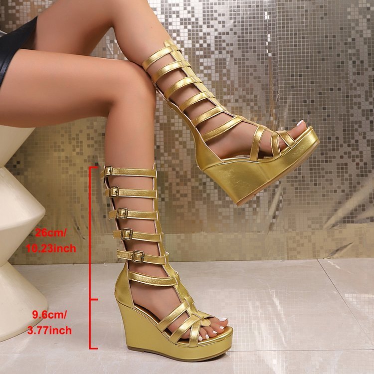 Heel Type: Platform wedge heel for stable, all-day height and a flattering leg-lengthening effect.Toe Shape: Open toe for a chic, summery look.Closure: Multiple adjustable buckle straps for a secure, customized fit.Color: GoldHeel Height: Approx. 9-10 cm (platform included) – dramatic yet stable for extended wear.Sole: Non-slip rubber platform sole for stability and durability.Design: Tall gladiator-style with strappy detailing for a bold, edgy aesthetic.