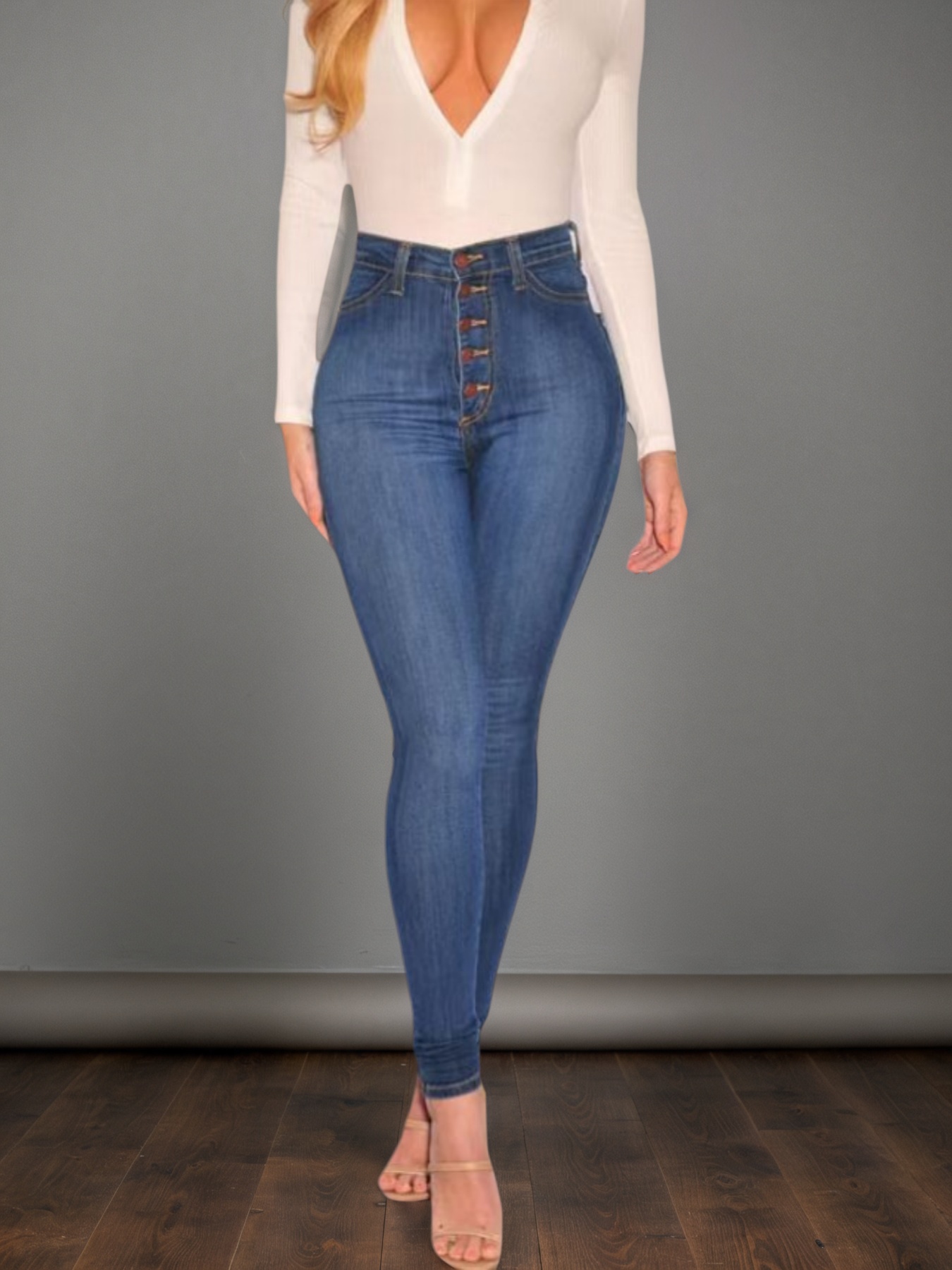 Women's Mid Blue High Waisted Buckle Tight Jeans Are Comfortable To Wear. High Waist Design, Buckle Design Adds A Sense Of Fashion,