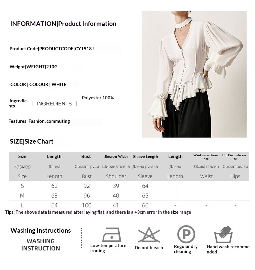 Product information: Color: White Size: S, M, L Fit: Slim fit Main fabric content: Polyester Sleeve length: Long sleeve