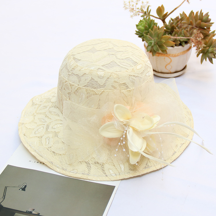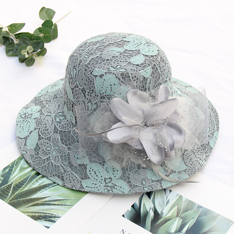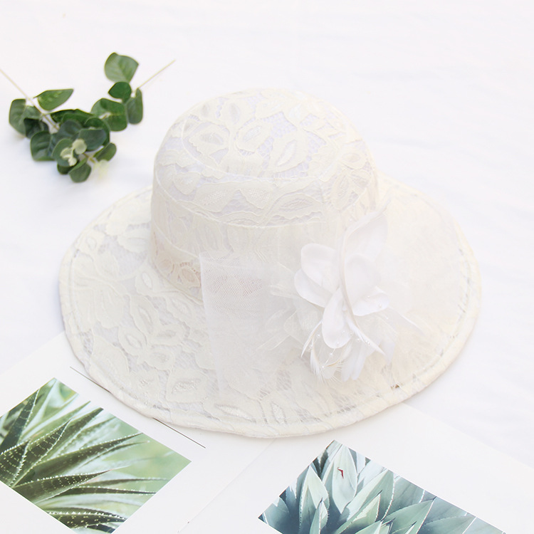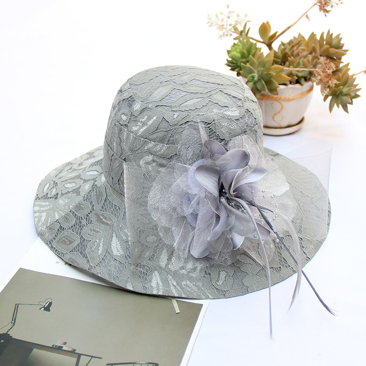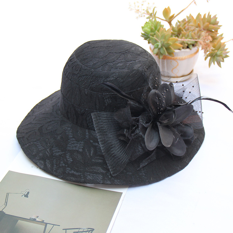 Color: Feather flower lace pot hat-gray, Feather flower lace pot hat-khaki, Feather flower lace pot hat-black, Feather flower lace pot hat-pink, Feather flower lace pot hat-beige, Feather flower lace pot hat-white, Feather Flower Lace Pot Cap-Beige, Feather Flower Lace Pot Cap-Wine Red, Feather Flower Lace Pot Cap-Blue Gray, Feather Flower Lace Pot Cap-Meat Powder