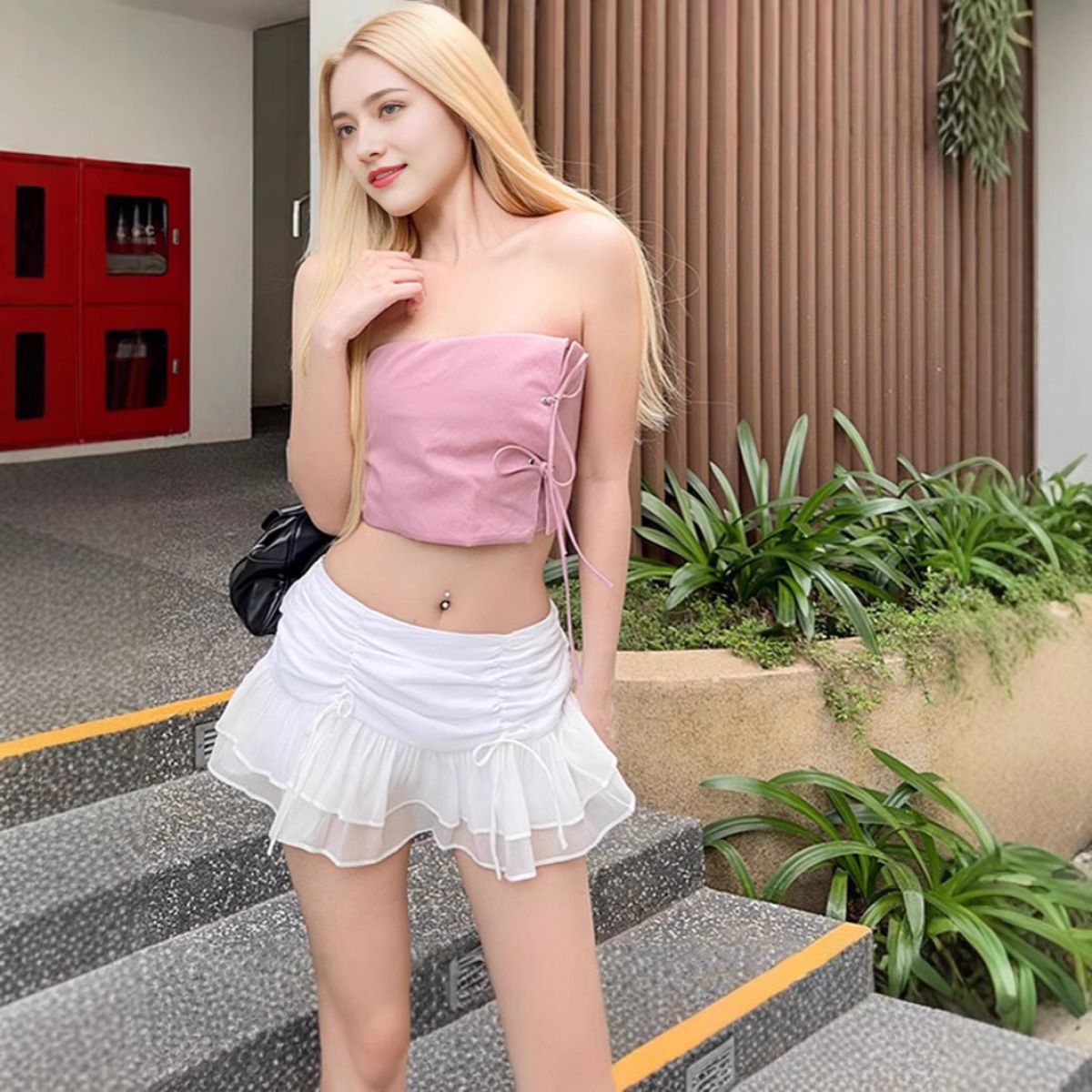 Women's New Sweet Girl Pleated Lace-up Stitching Mesh Slimming Skirt