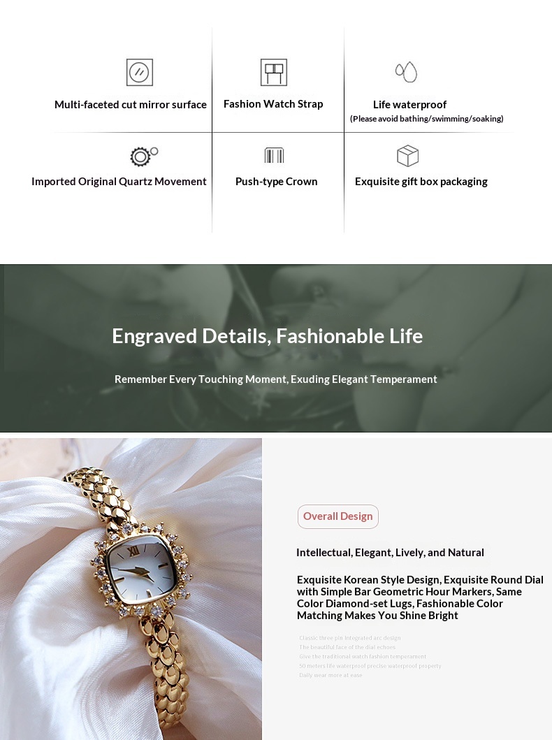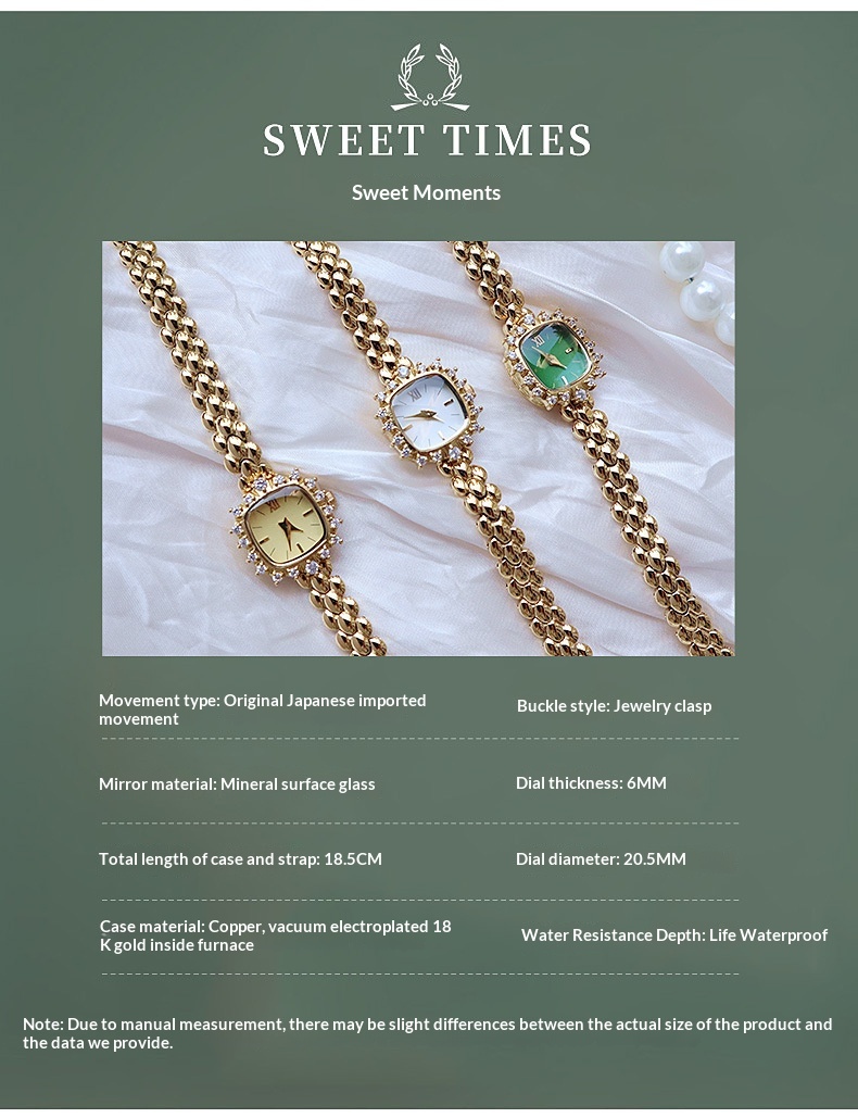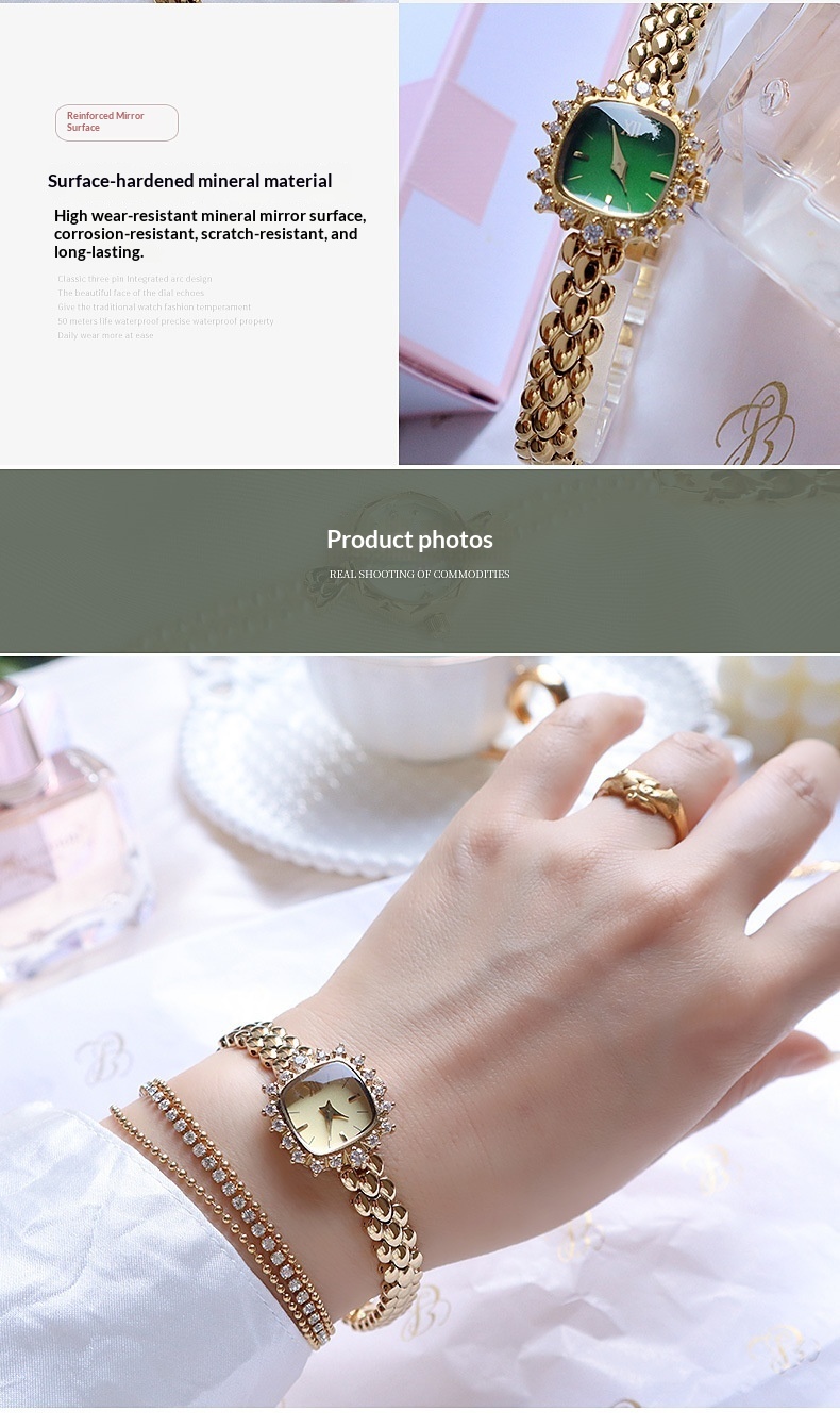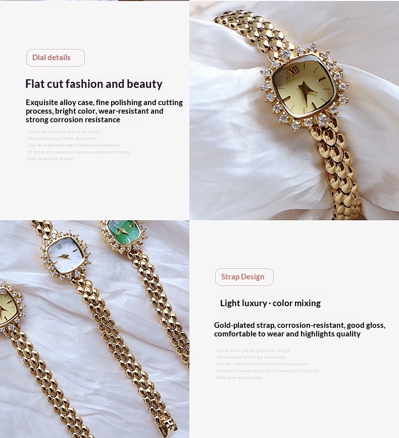 Color: Gold dial, gold-and-white dial, gold case with gemstones and a green dial