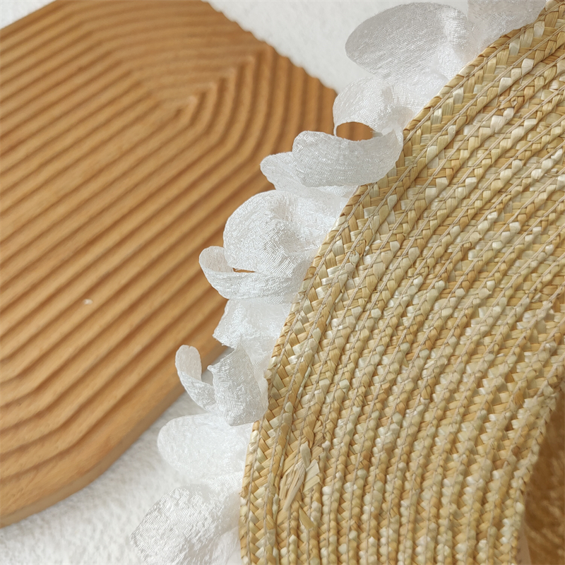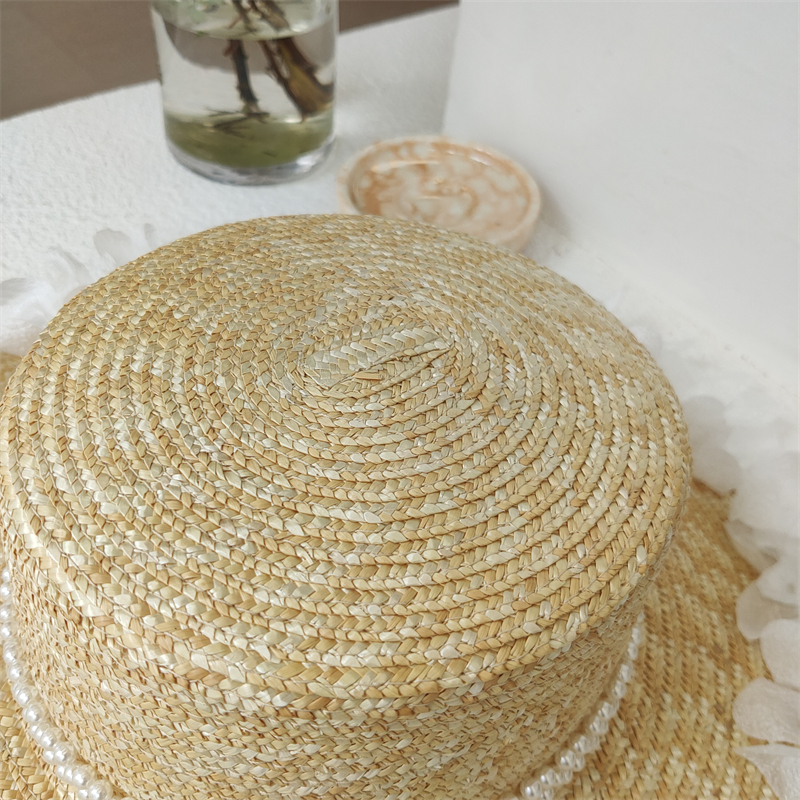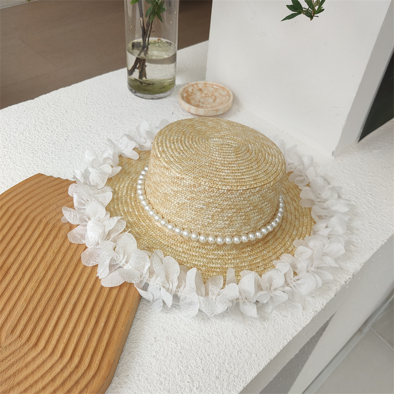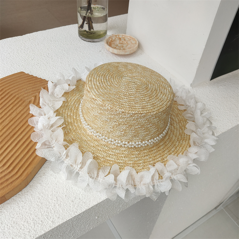 Colour: Hat top lace, single row of pearls + brim lace flowers, small pearls + brim lace flowers, large pearls + brim lace flowers