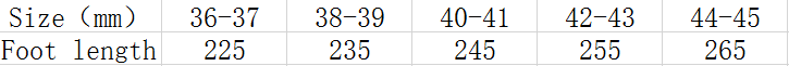 Shoe size: 36-37 [suitable for 35-36 feet] 38-39 [suitable for 37-38 feet] 40-41 [suitable for 39-40 feet] 42-43 [suitable for 41-42 feet] 44-45 [suitable for 43-44 feet]