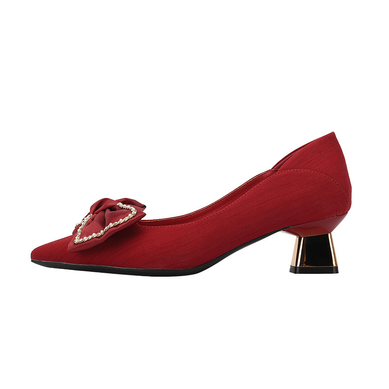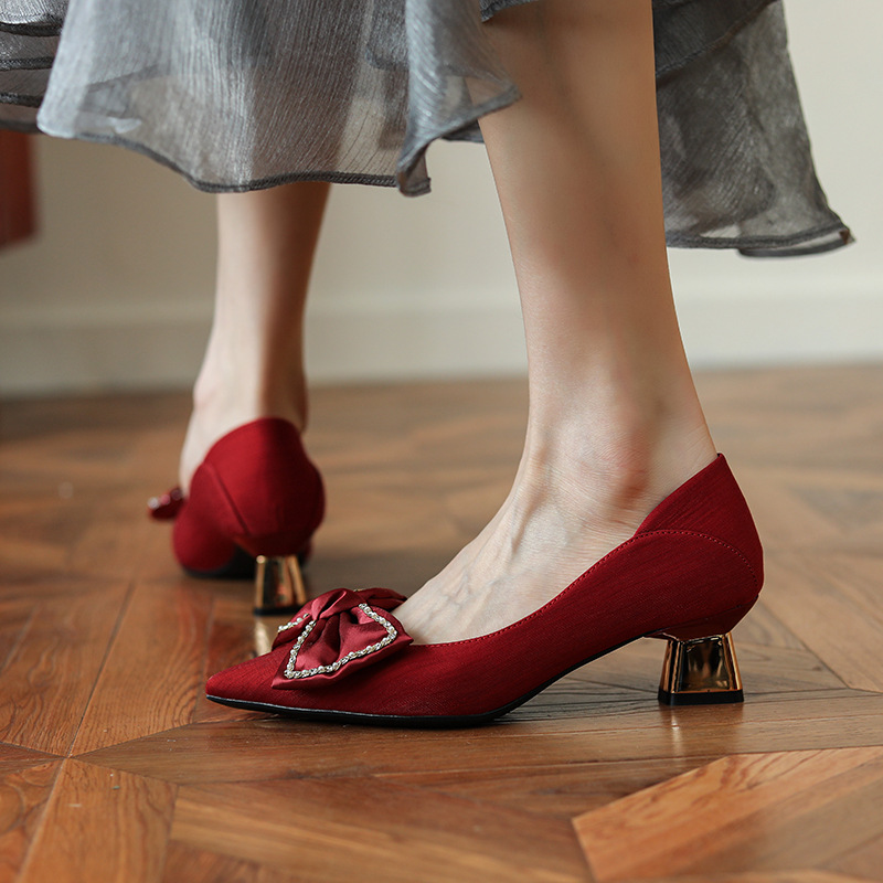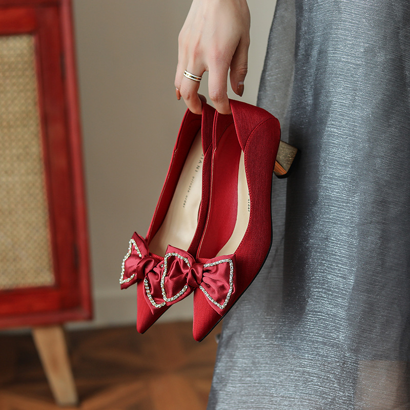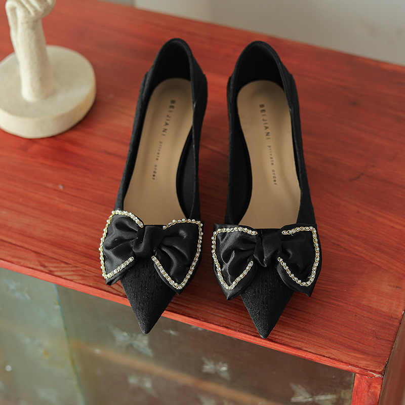 Women's Pointed Toe Chunky Heel Shoes With Rhinestone Bow High Heels
