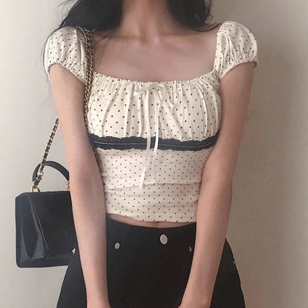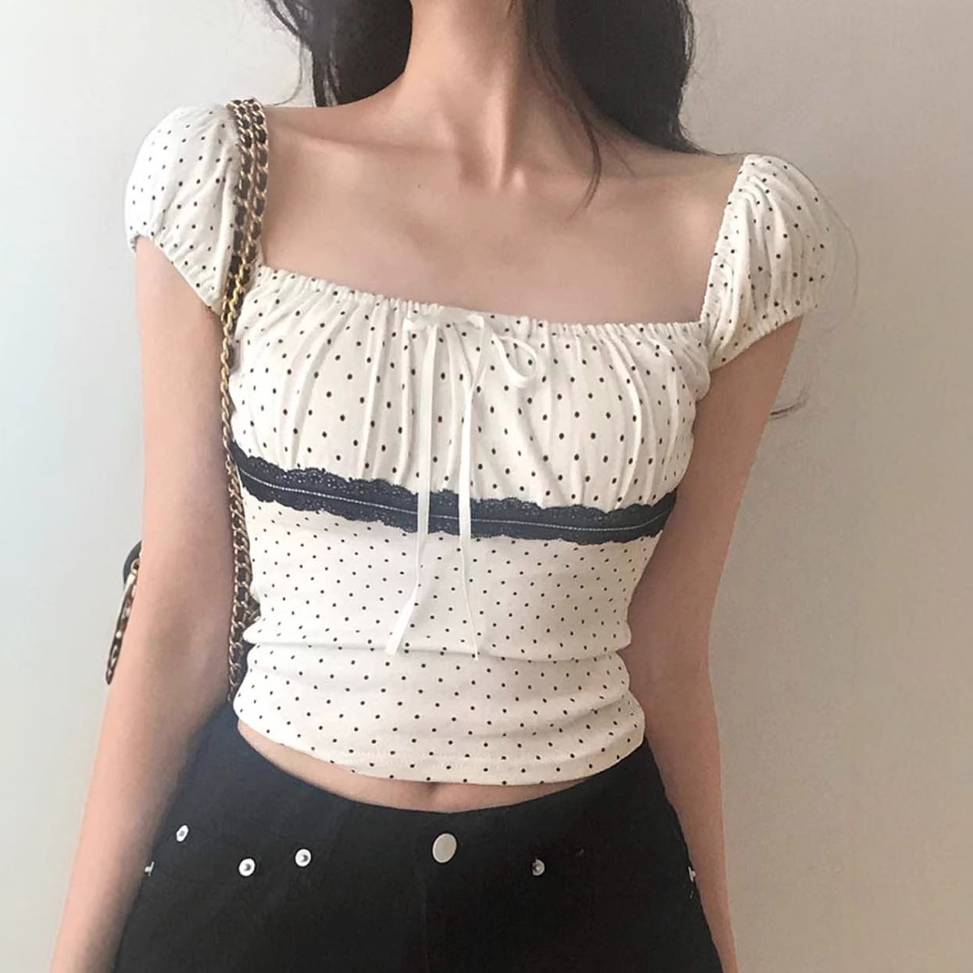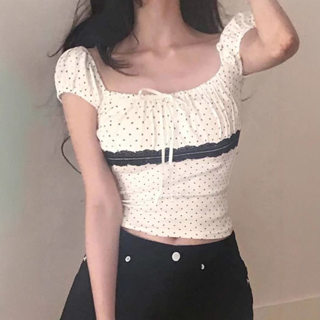 Women's Polka Dot Lace Stitching Tied Square Collar Short Sleeve Top