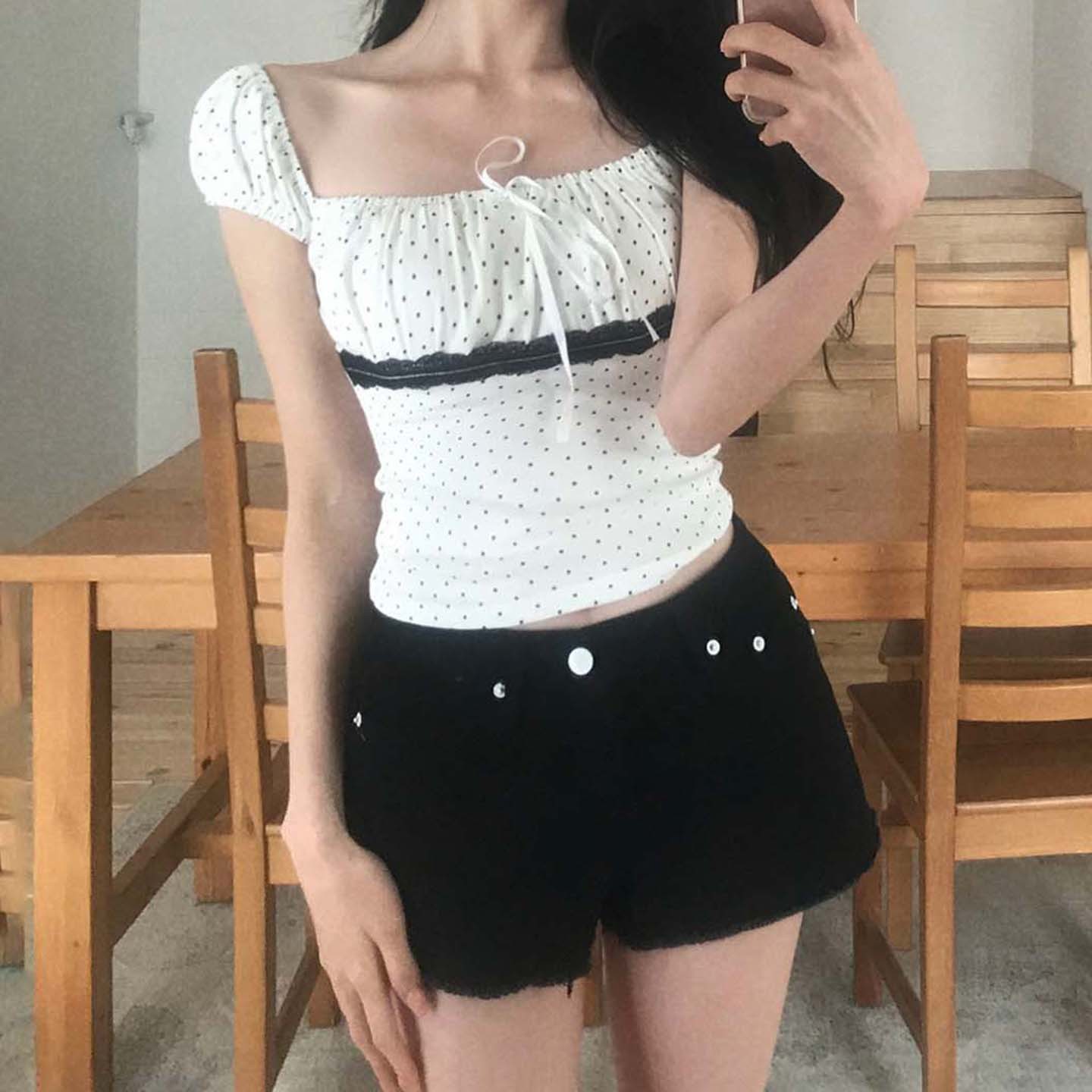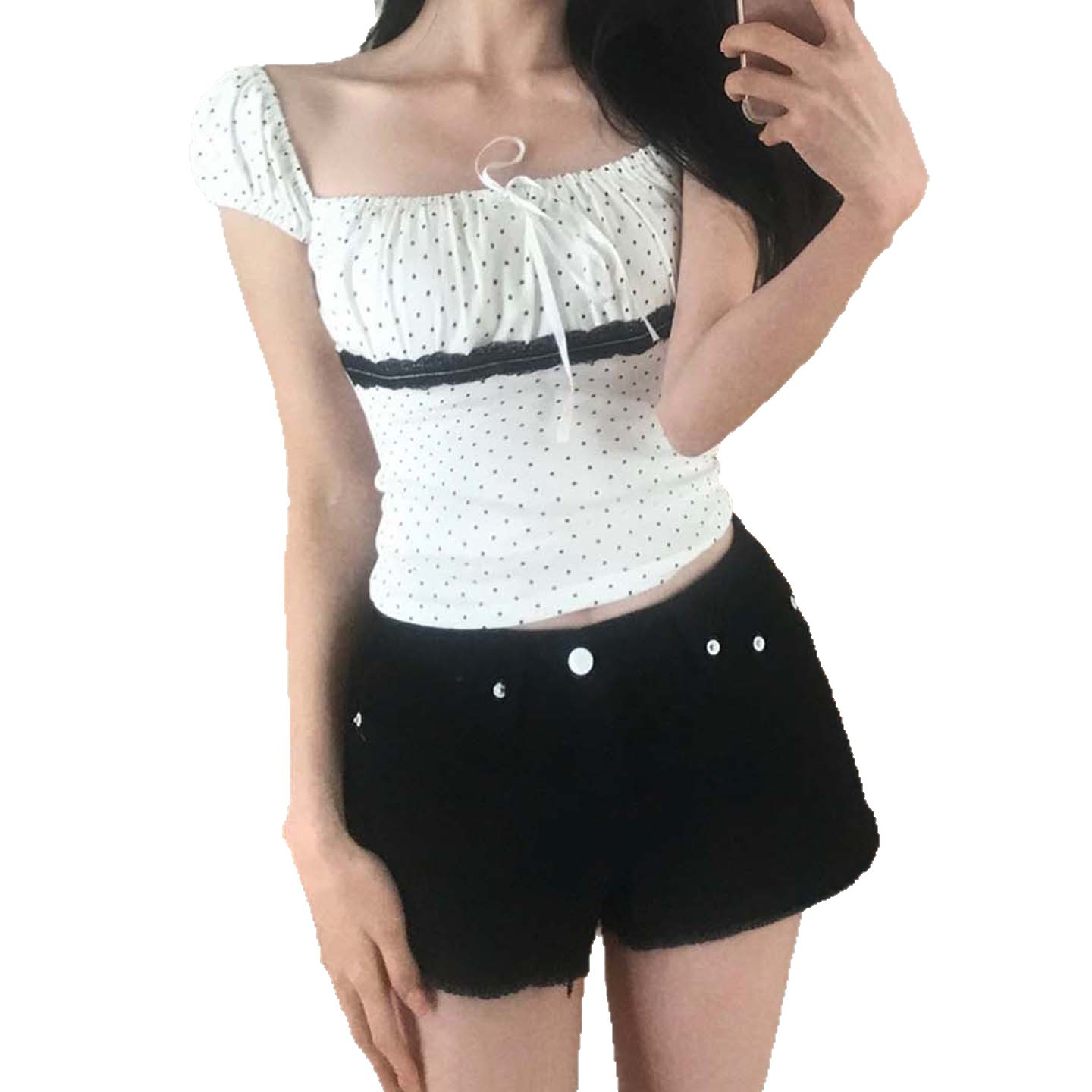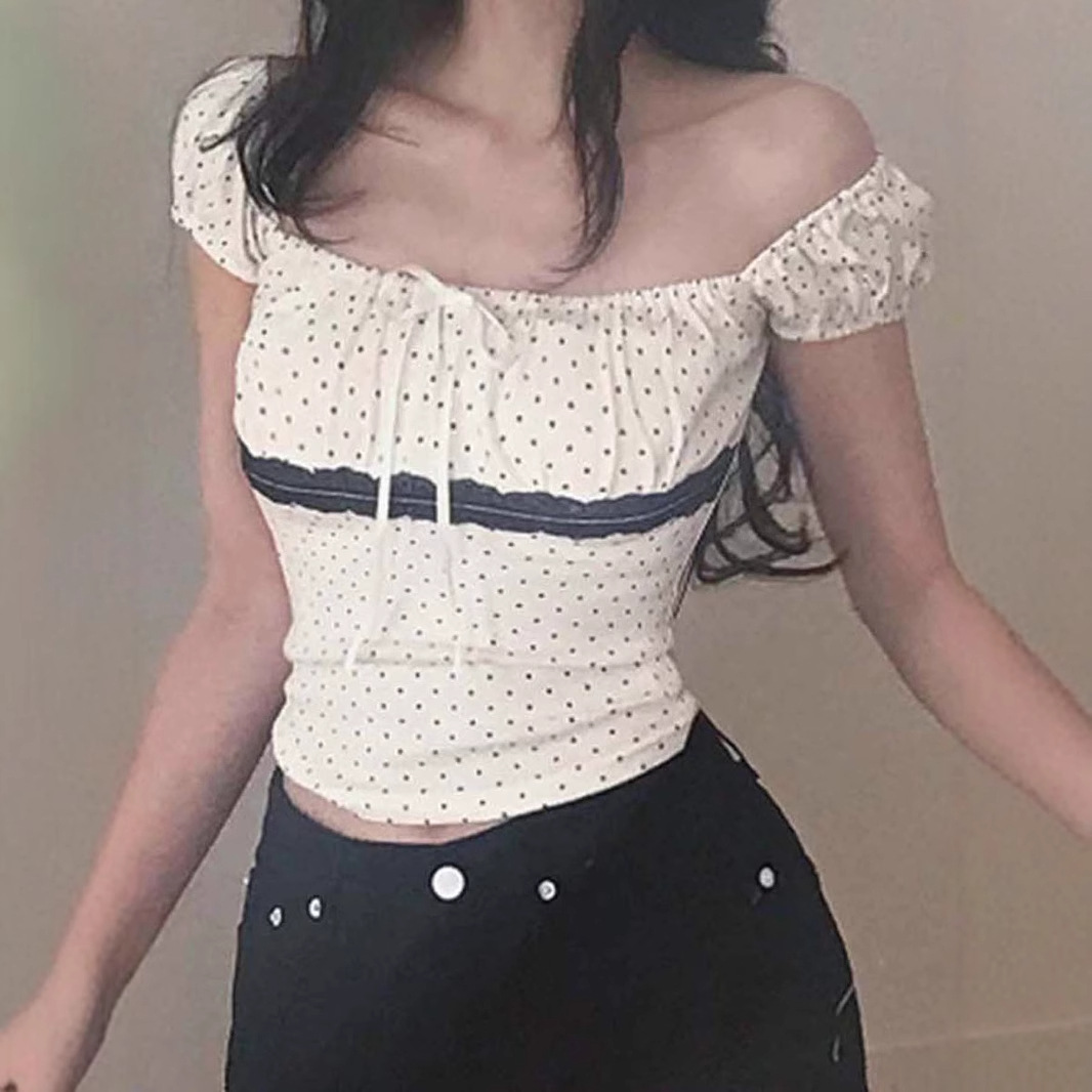 Women's Polka Dot Lace Stitching Tied Square Collar Short Sleeve Top