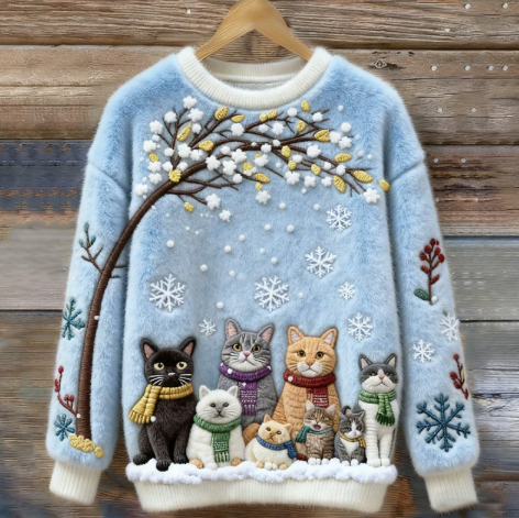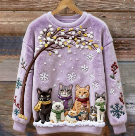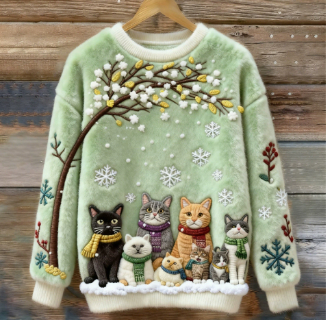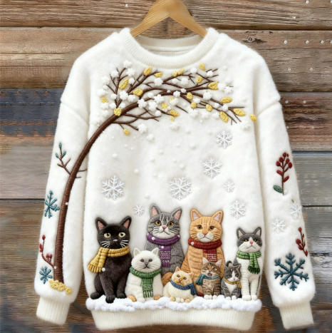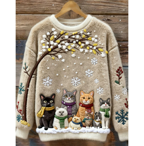 Womens Printed Cat Christmas Crew-Neck Sweatshirt Top