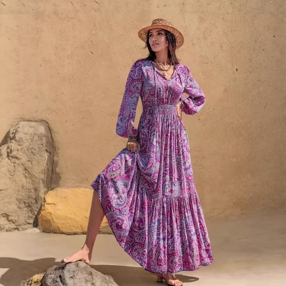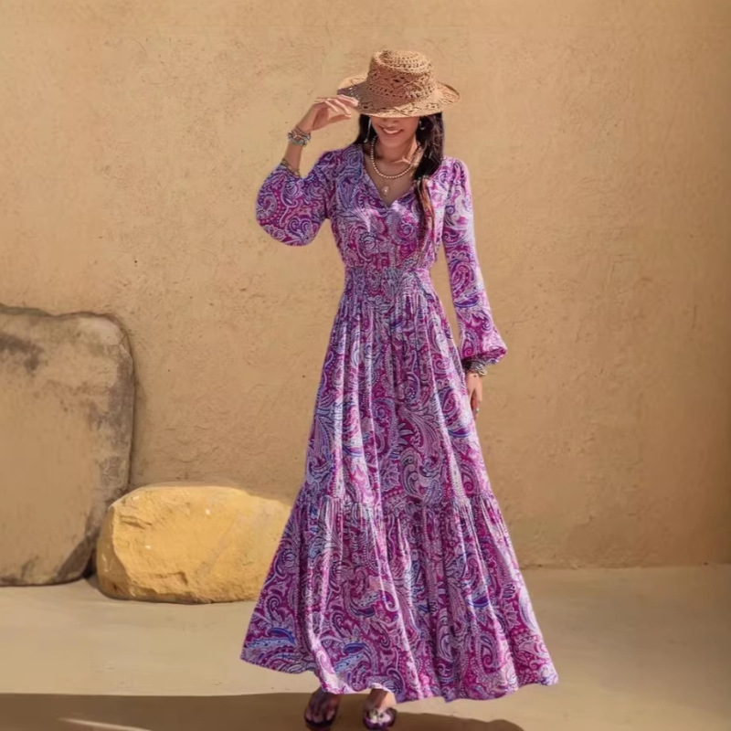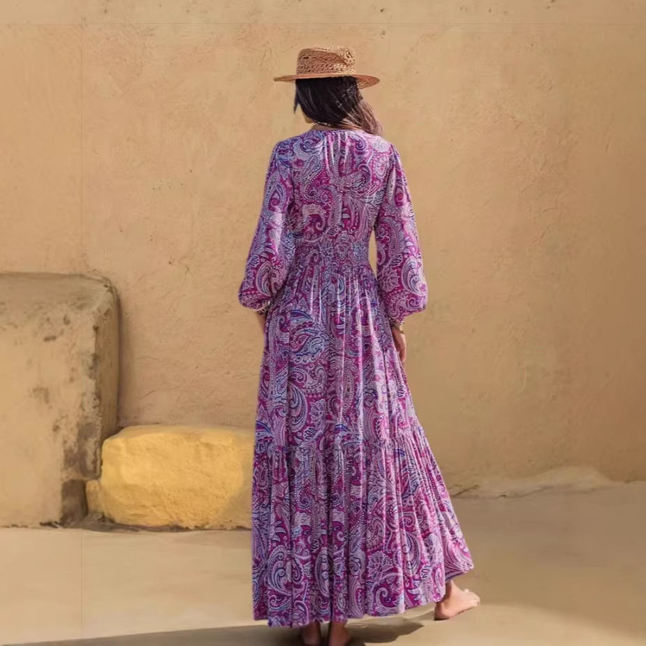 Womens Printed V Neck Drawstring Waist Dress