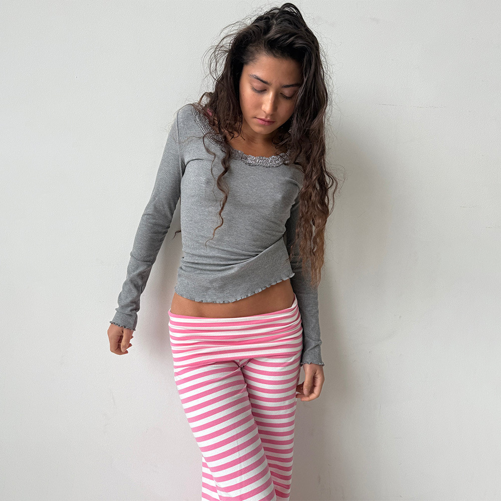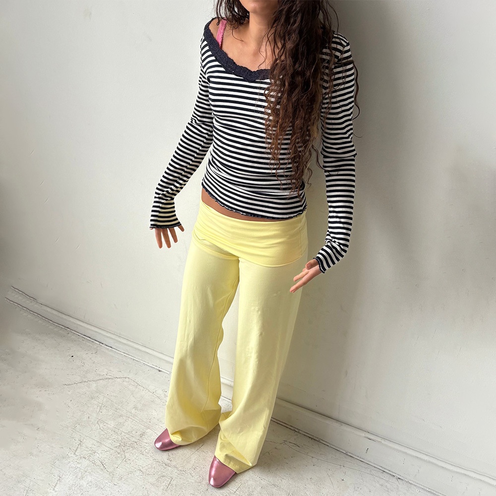 Colors: Pink, yellow, navy blue; made from milk silk fabric with a striped design and a relaxed fit.