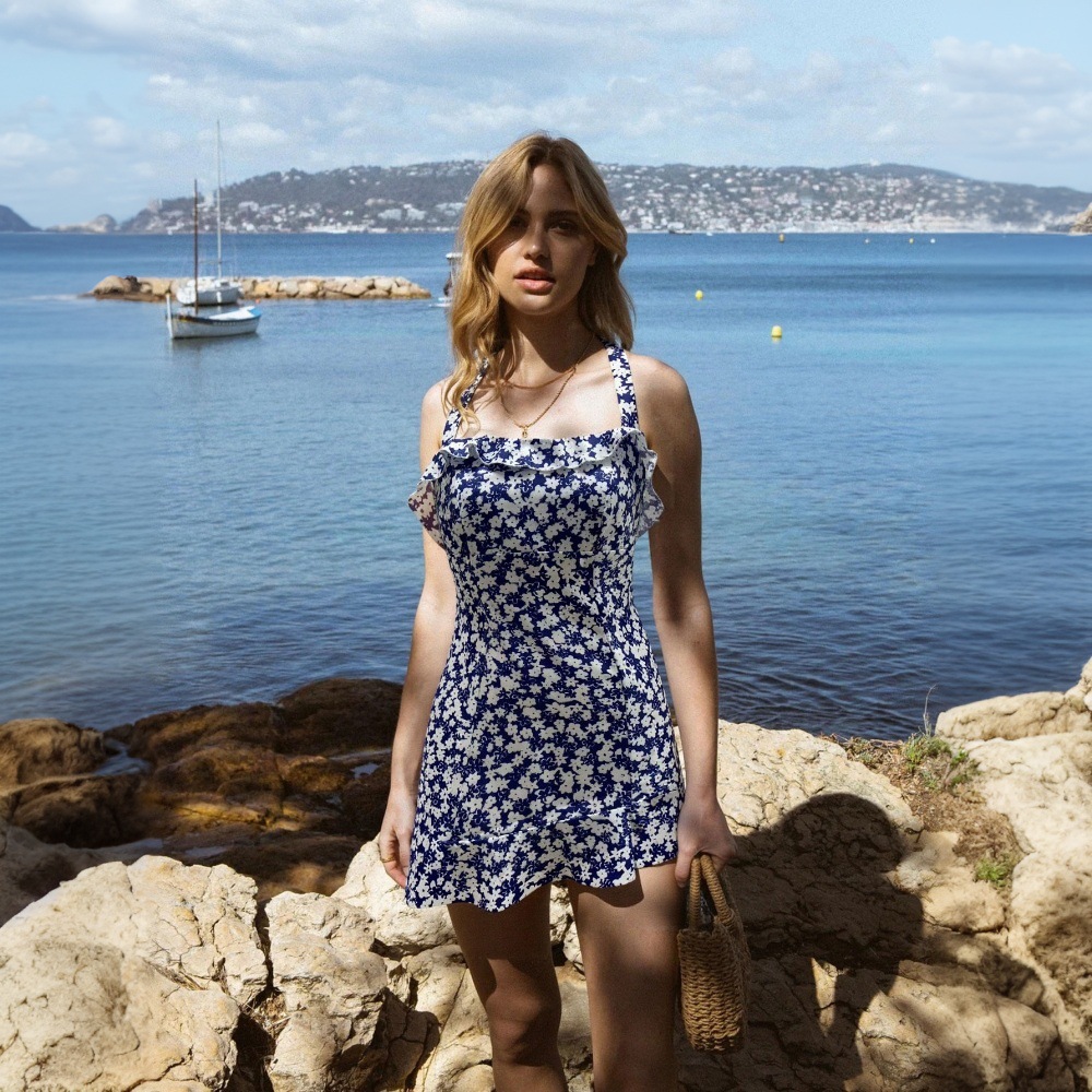 Color: Blue background with white flowers